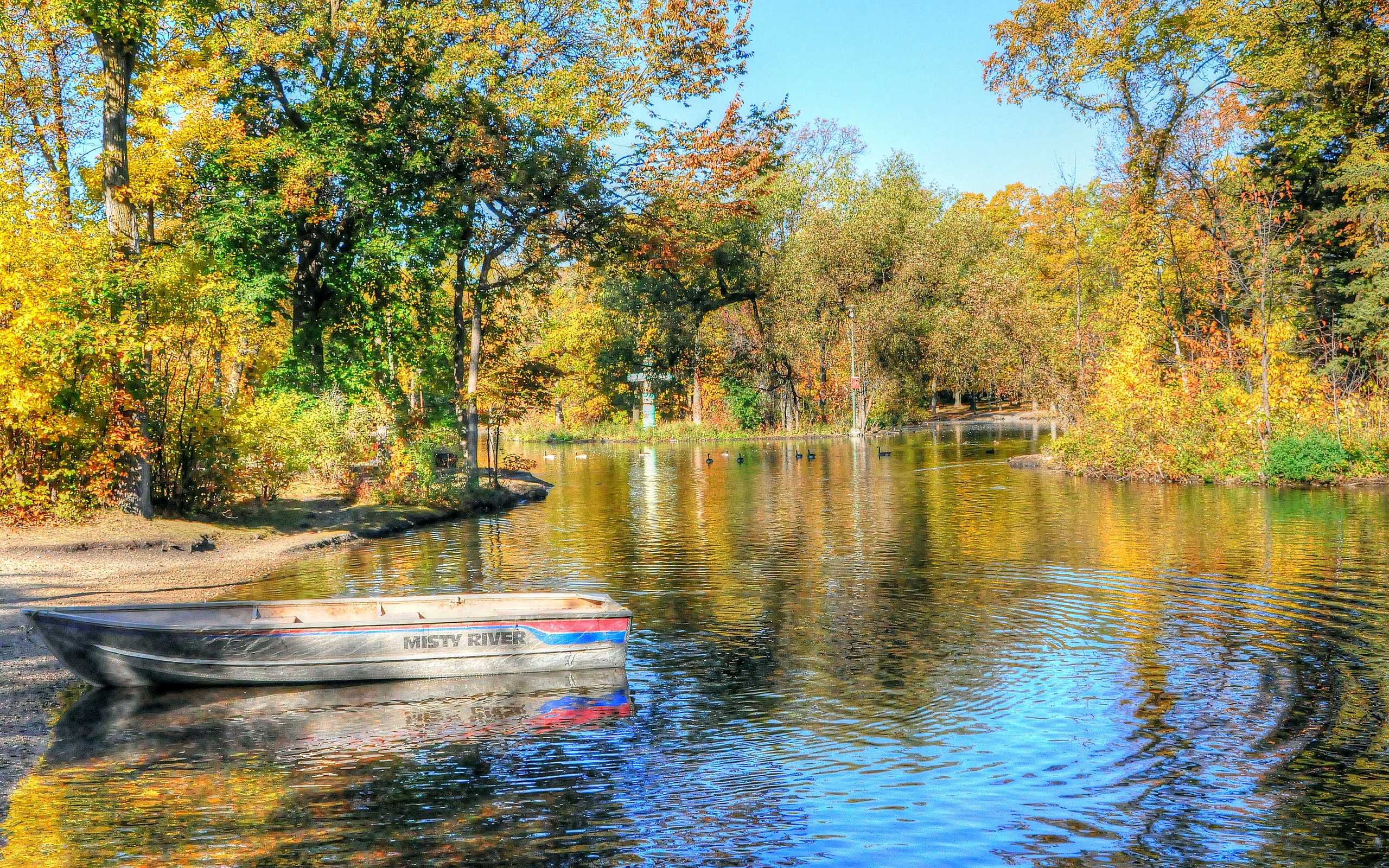 Description: A boat is sitting on the water in a park setting with trees in the background and a path leading to the shore.