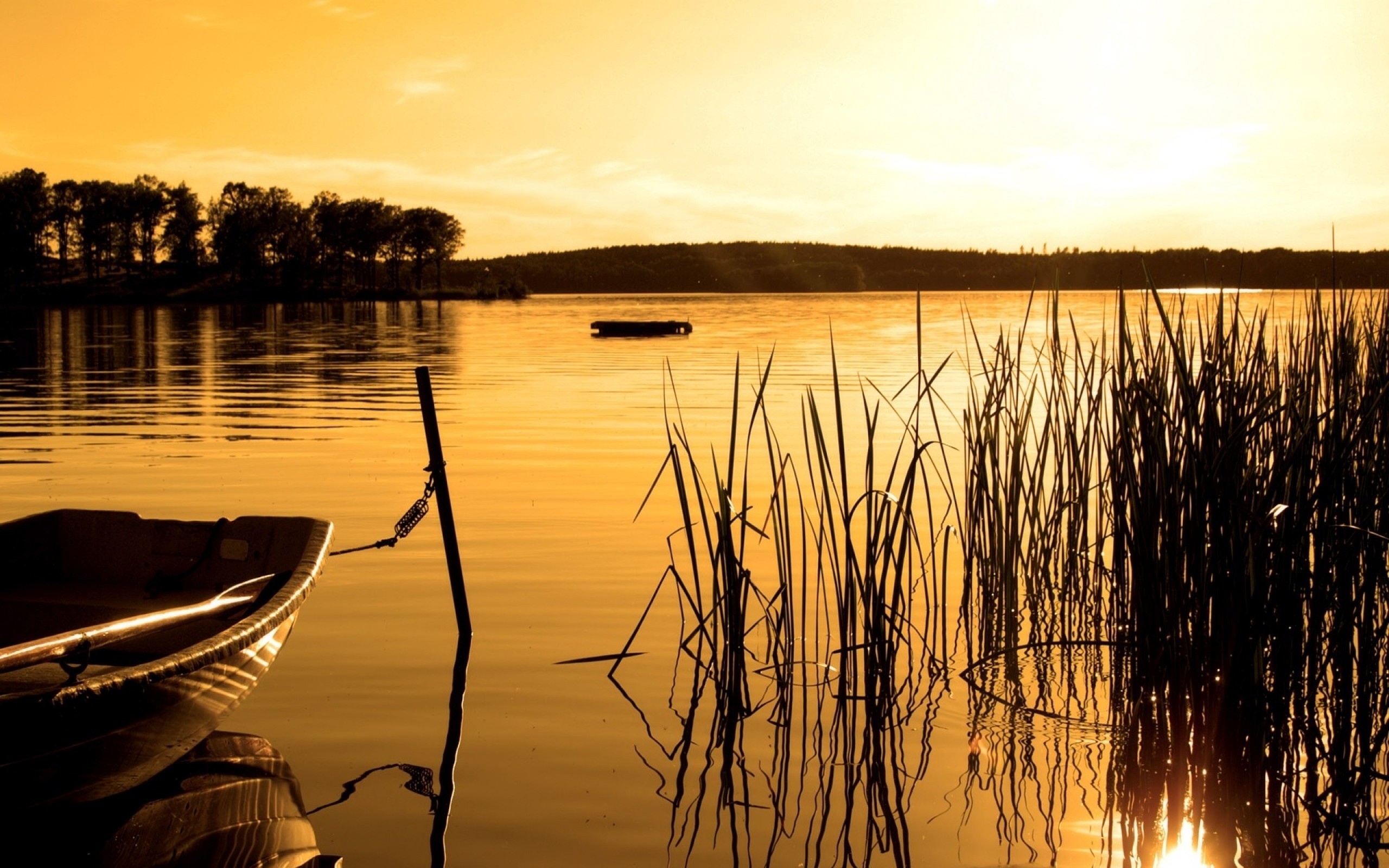 Description: A boat is sitting in the water at sunset or dawn with the sun shining on the water and reeds in the foreground.