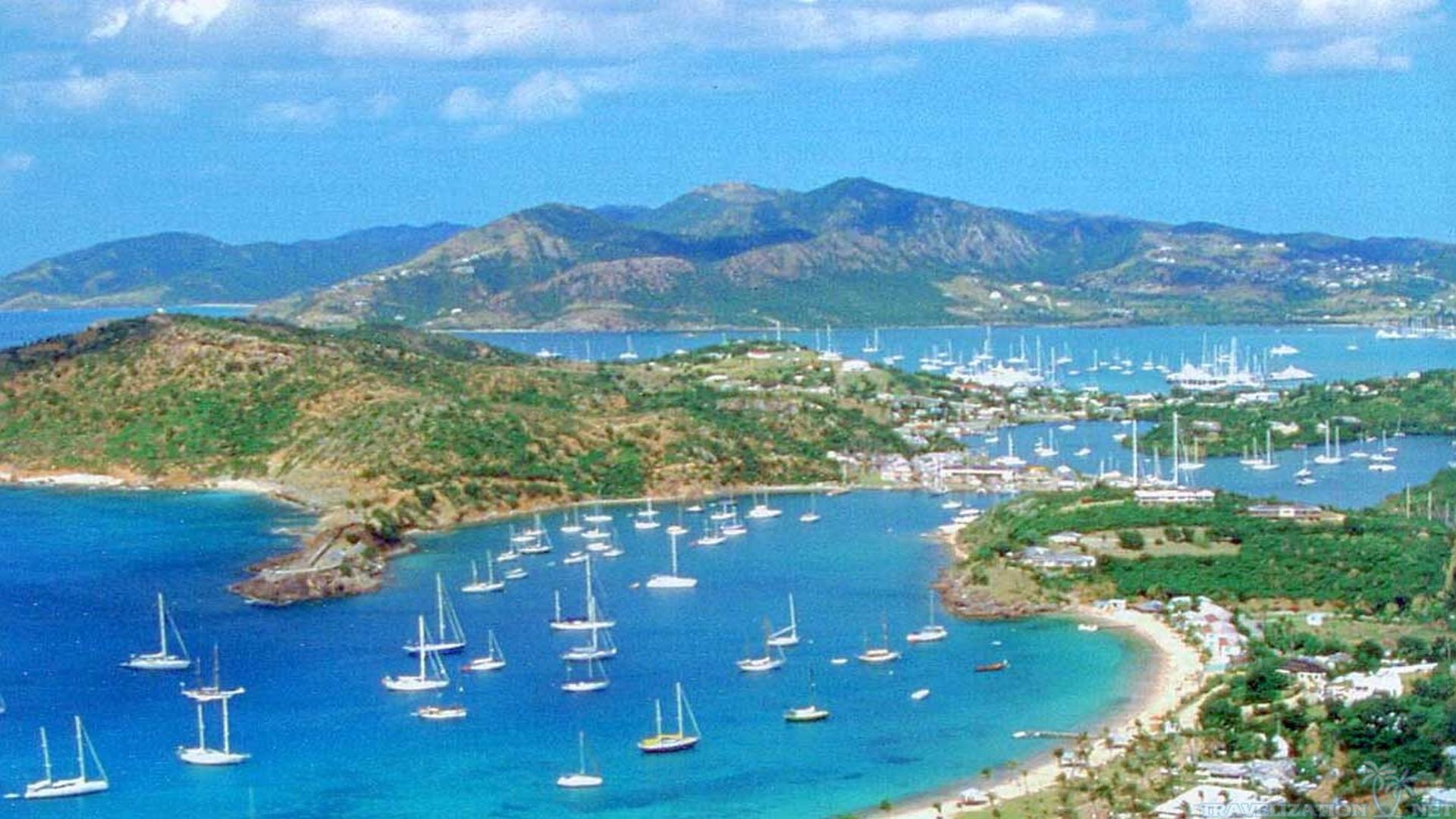 Description: A group of boats floating in a body of water near a beach and mountains in the background with a blue sky.