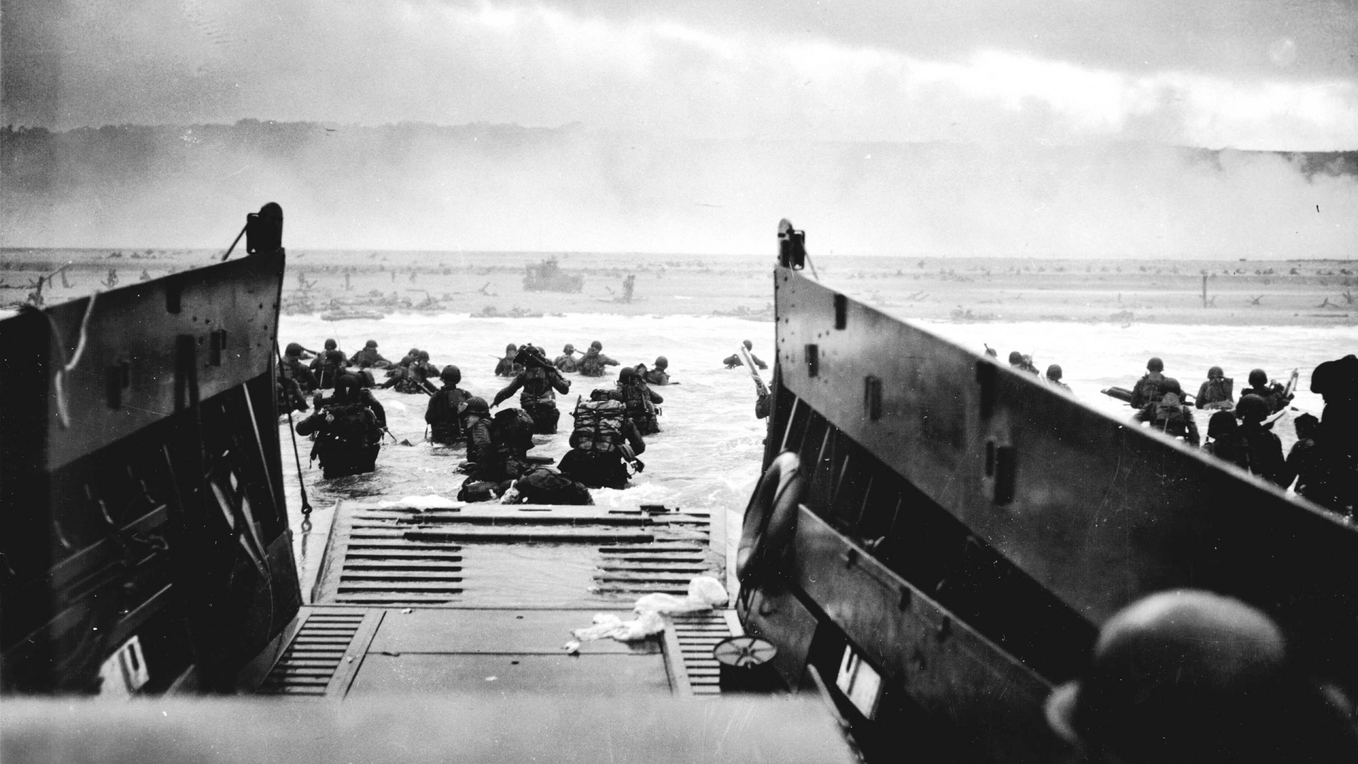 Description: A group of people on boats in the water near a beach with smoke coming out of the sky and a few people on the water.