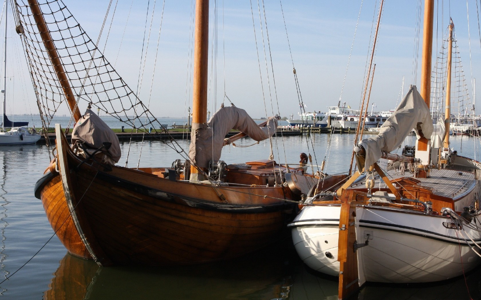 Description: Two boats are docked in the water near a dock with other boats in the water and a dock with several boats.