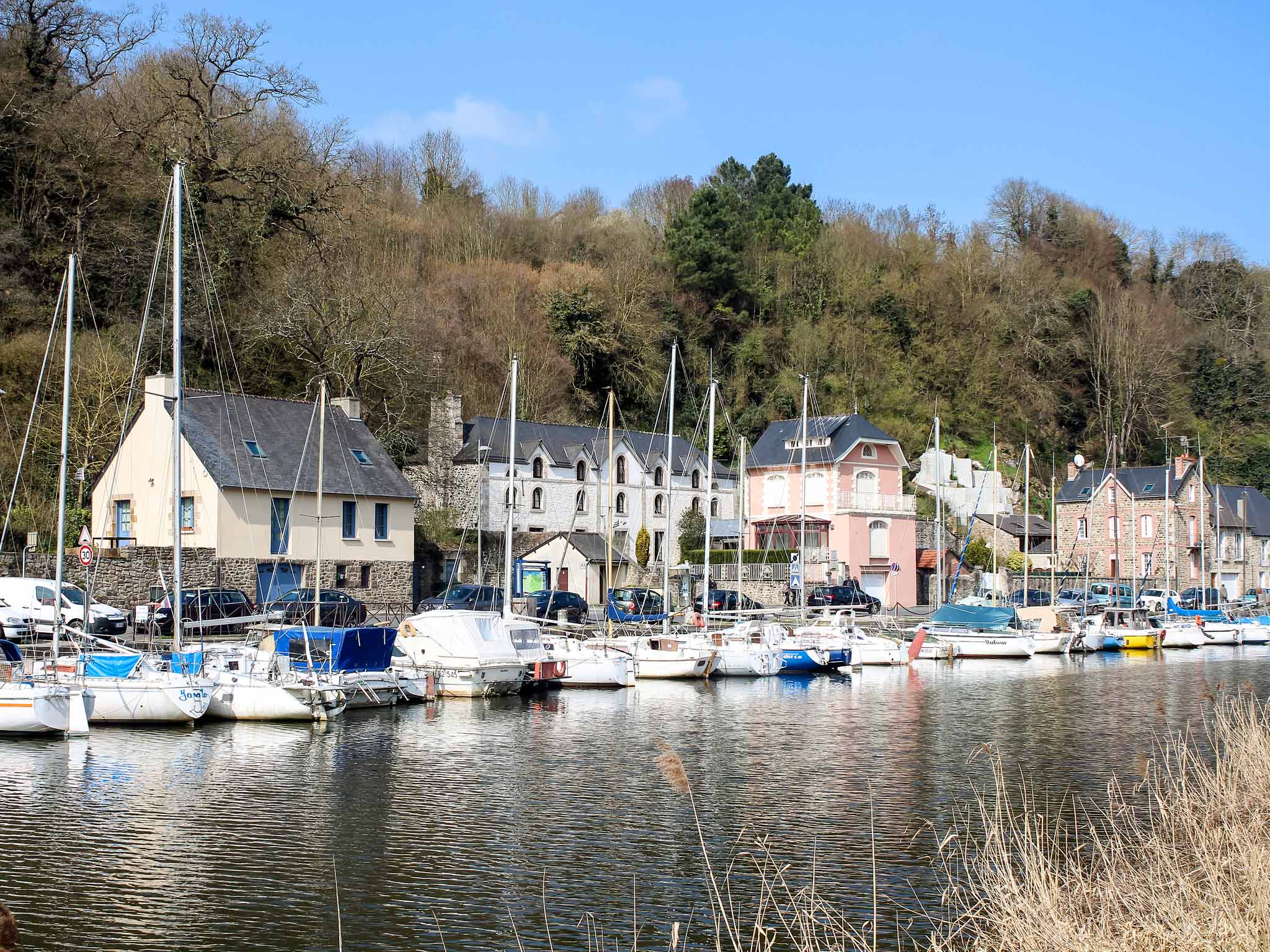 Description: A group of boats are docked in a harbor near a row of houses and trees on a hill side.