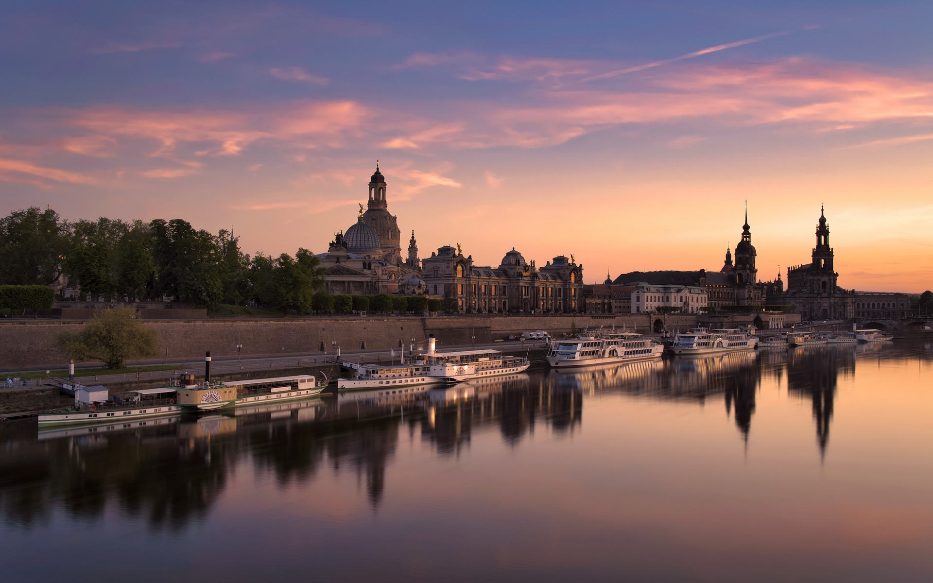 Description: A group of boats are docked in a harbor at sunset or dawn with a city in the background and a church steeple in the distance.
