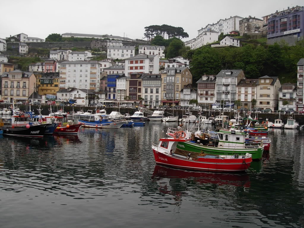 Description: A group of boats floating on top of a lake next to a city covered in buildings and trees on a cloudy day.