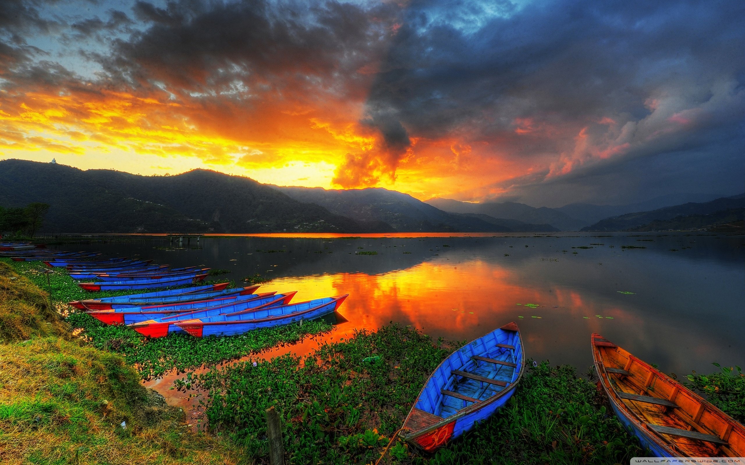 Description: A group of boats sitting on top of a lake under a cloudy sky at sunset with mountains in the background.