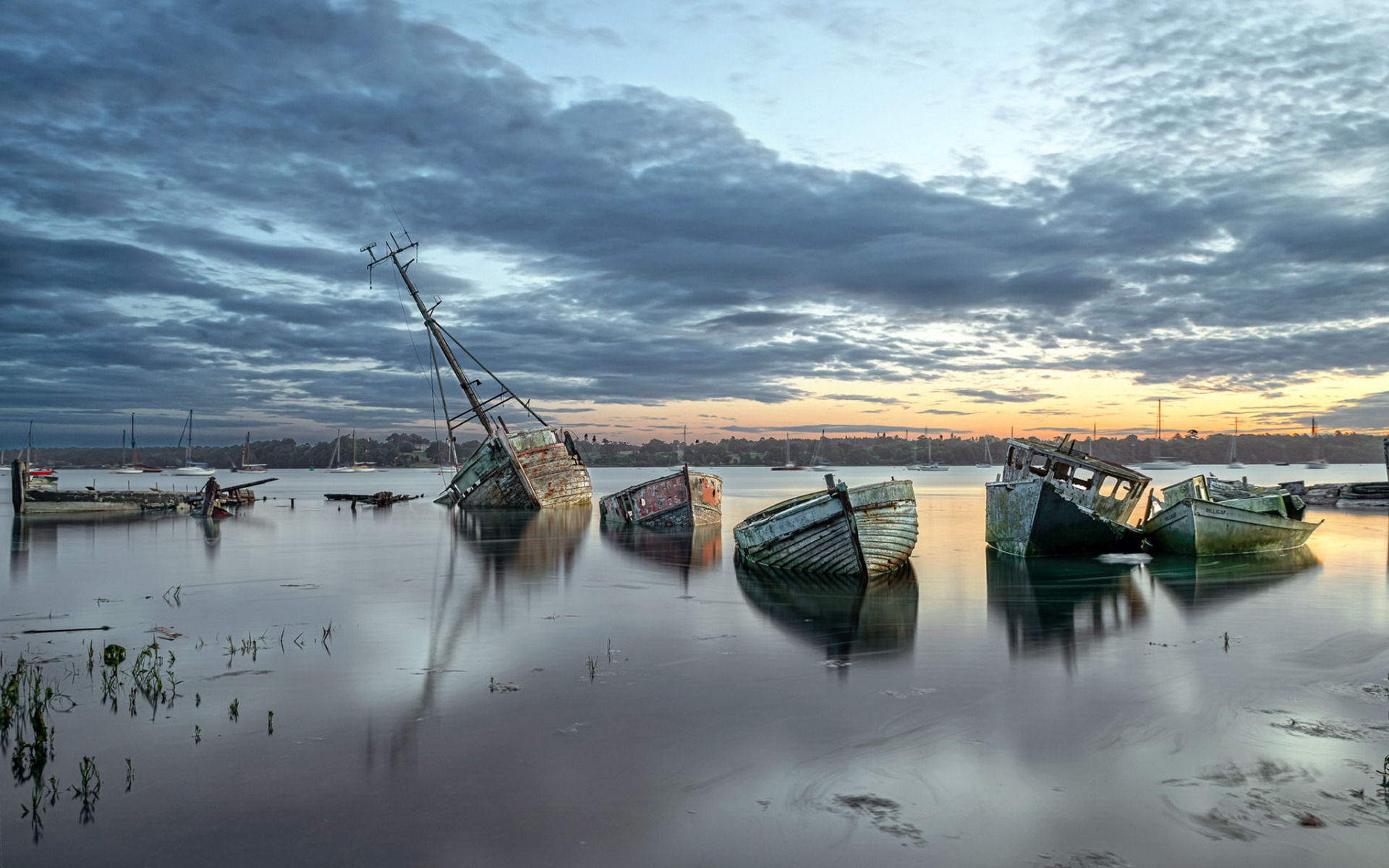 Description: A group of boats sitting on top of a lake under a cloudy sky at sunset or dawn with a few clouds.