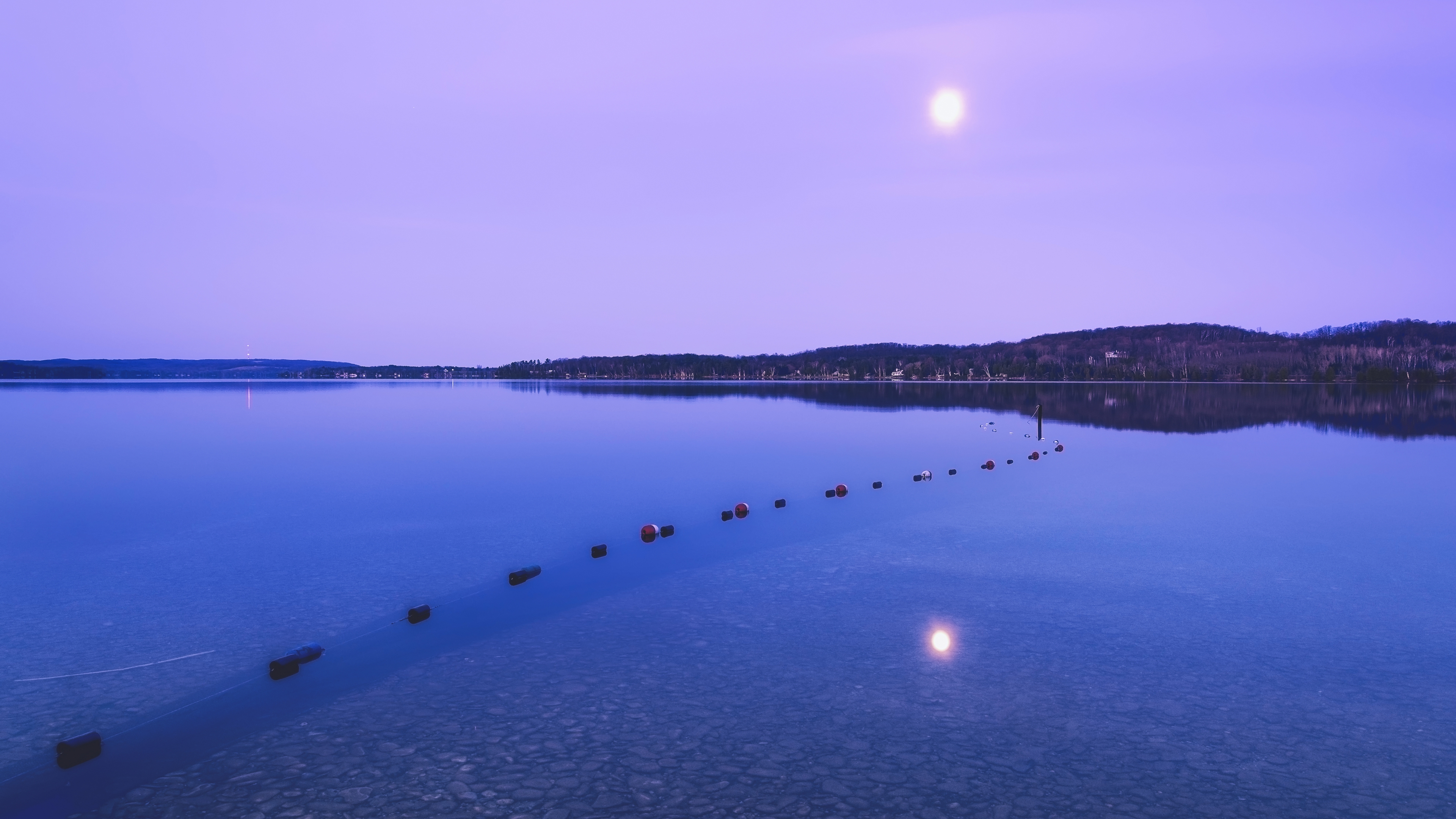 Description: A group of boats floating on top of a lake next to a forest covered hillside at night time with a full moon.