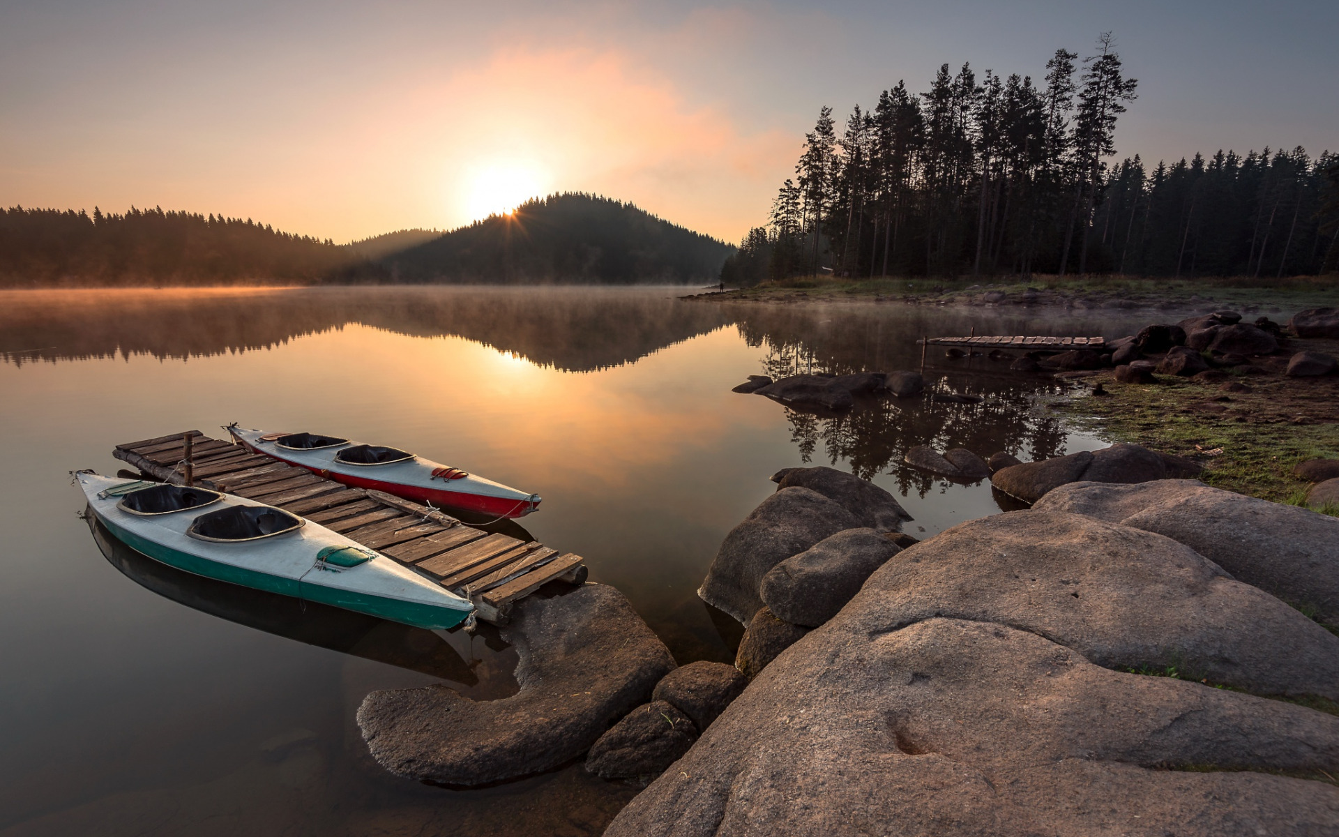Description: Two boats are docked on a lake at sunset or dawn with a mountain in the background and a foggy sky.