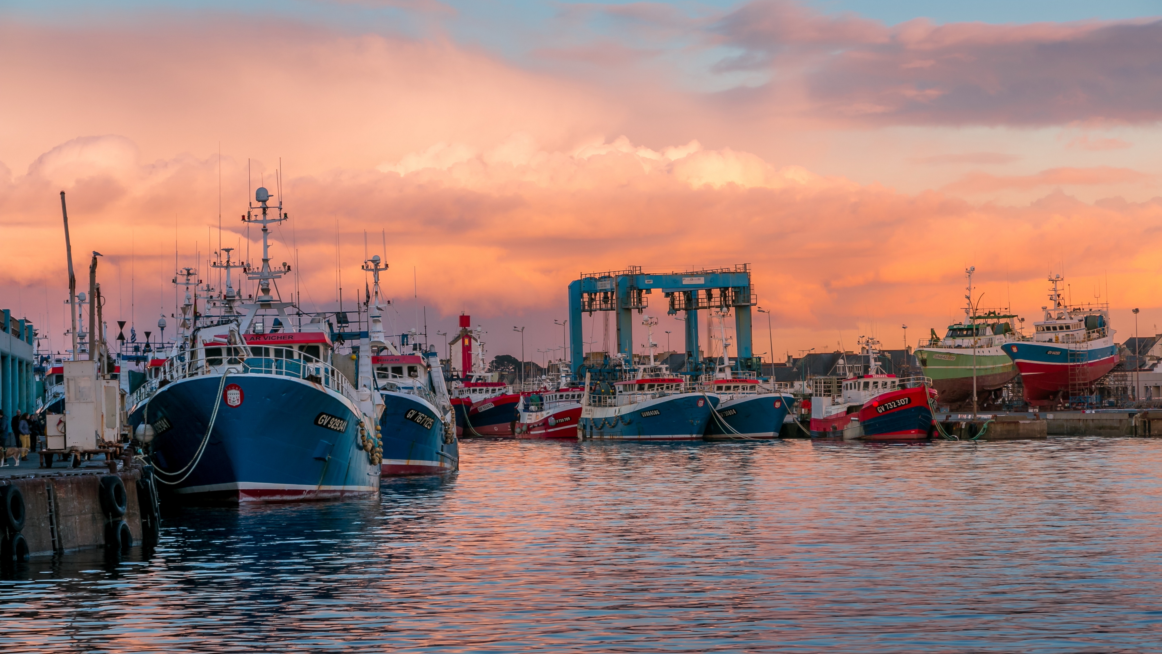 Description: A group of boats docked at a pier at sunset or dawn or dawn or dawn or dawn.