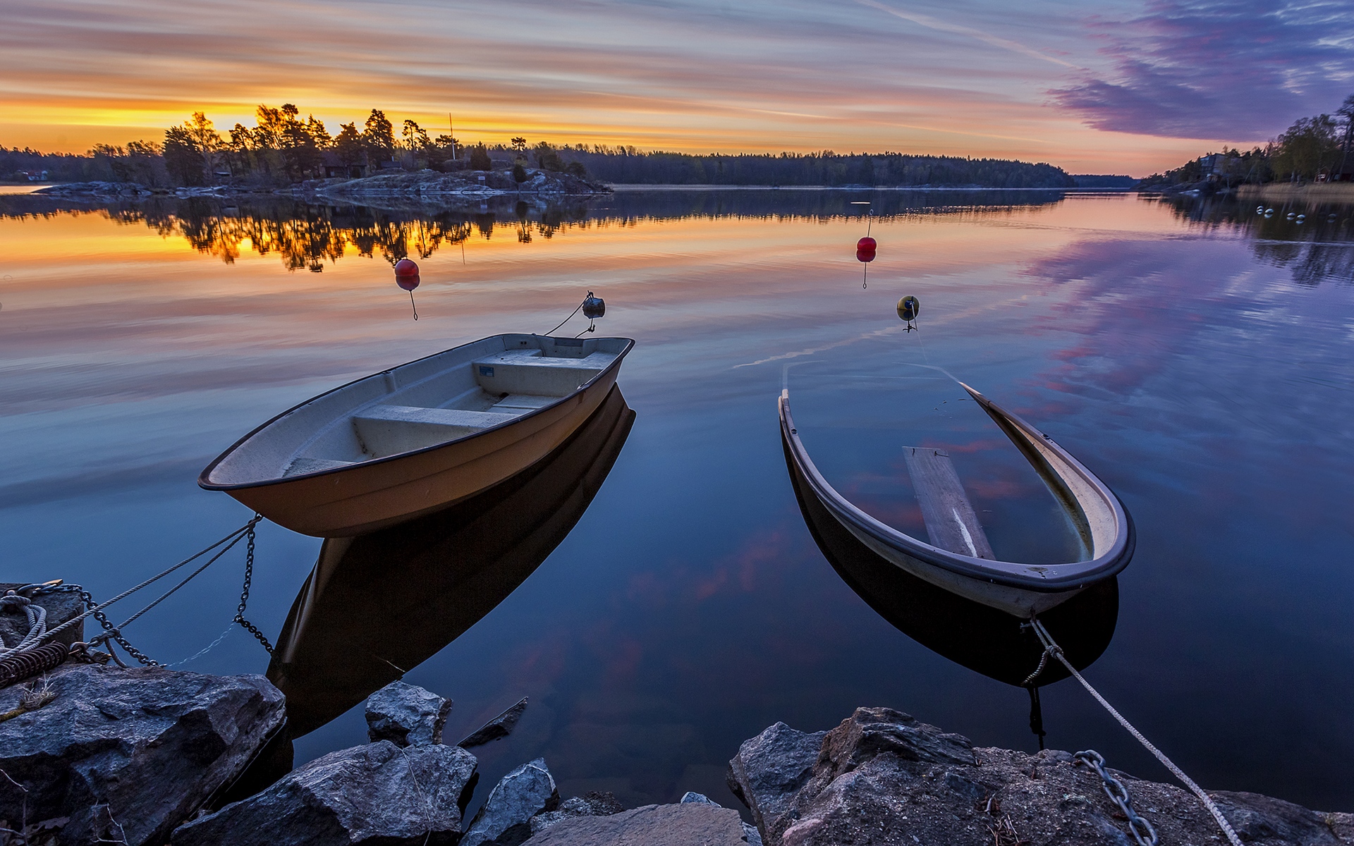 Description: A couple of boats that are sitting in the water near rocks and a dock with a boat in the water.