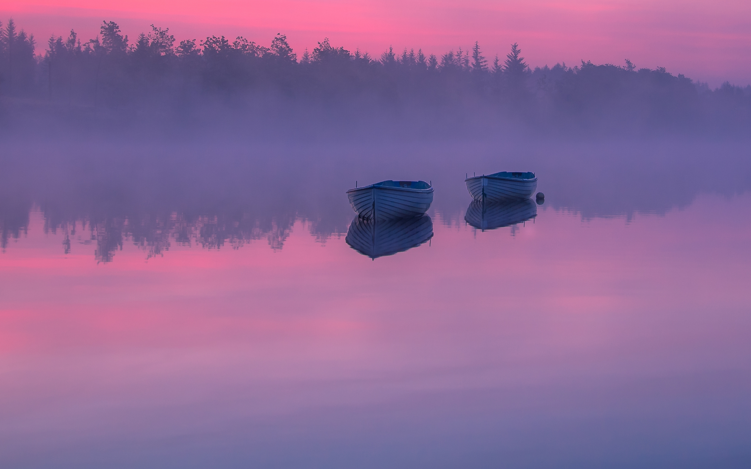 Description: Two boats are sitting in the water at sunset with a pink sky in the background and trees in the foreground.