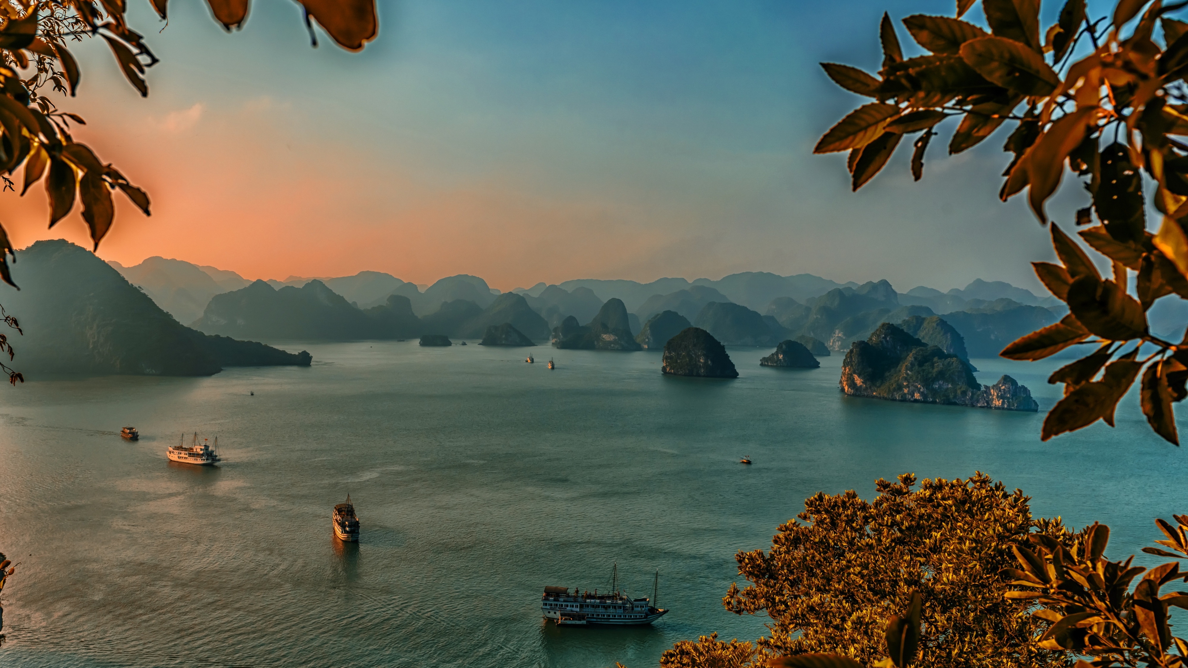 Description: A group of boats floating on top of a large body of water near mountains and trees in the distance.