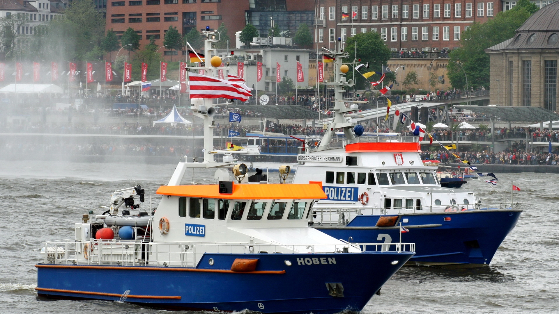 Description: A couple of boats that are in the water near each other in the water with a lot of people on it.