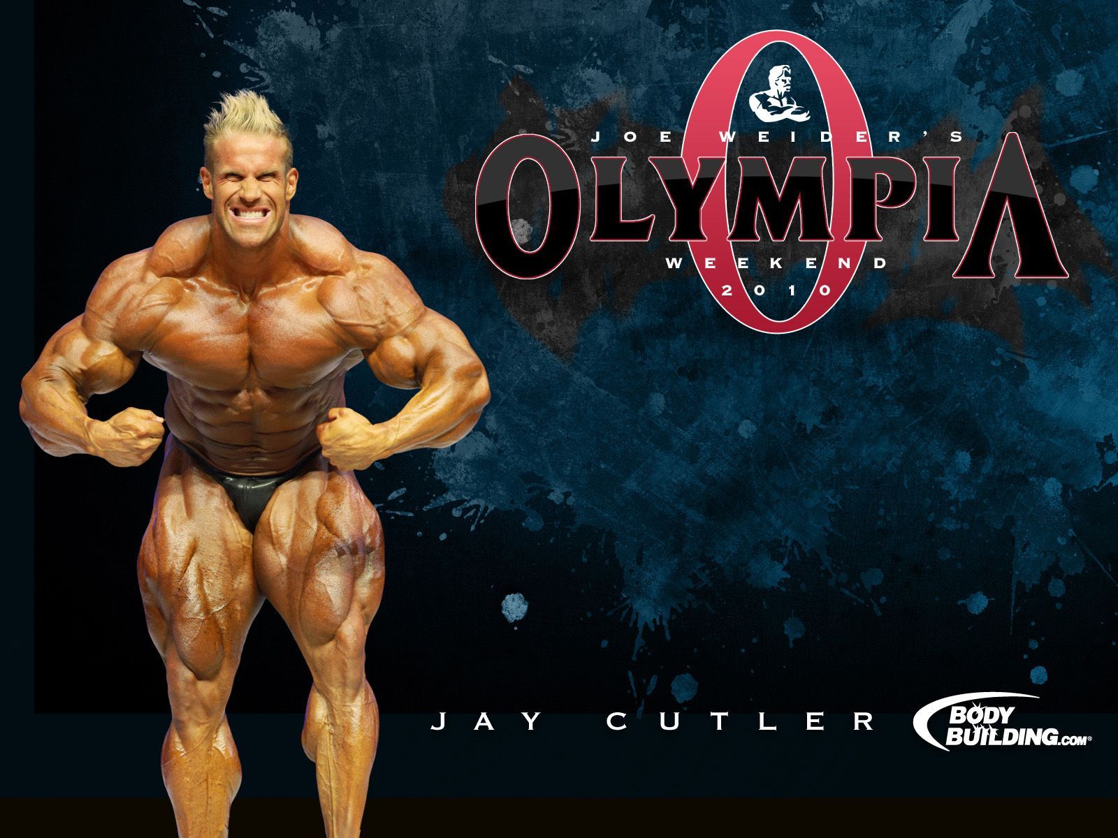 Description: A man with a bodybuilding figure standing in front of a poster for the olympics weekend event.