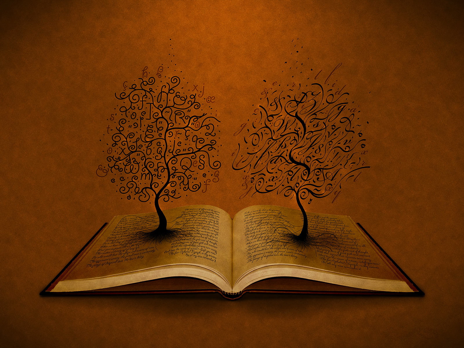 Description: A book with a tree on top of it and a light on the side of it with a red background.