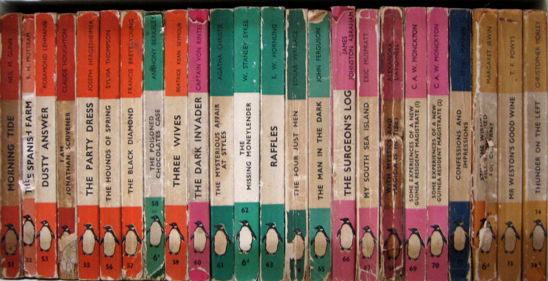Description: A row of books sitting on top of a shelf next to each other on a table top with a clock.