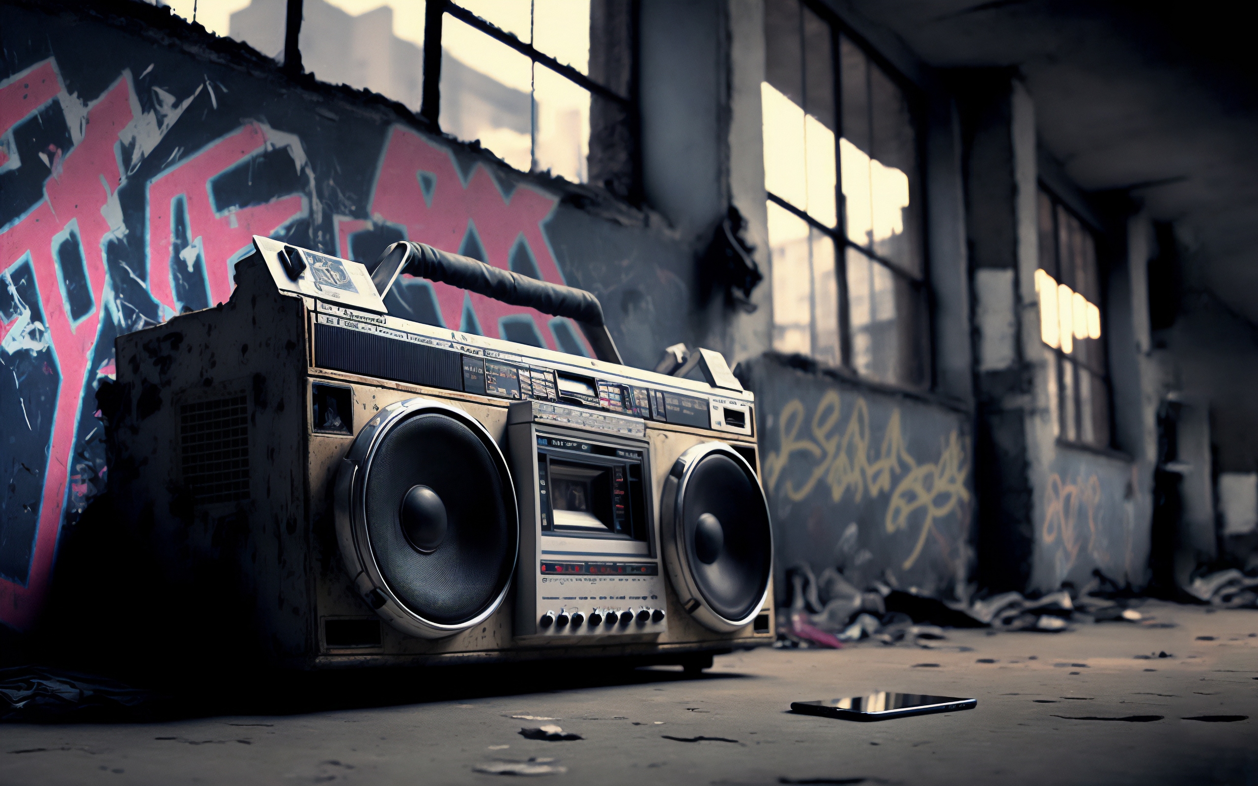 Description: A boombox sitting in a run down building with graffiti on the walls and windows behind it is a broken radio.