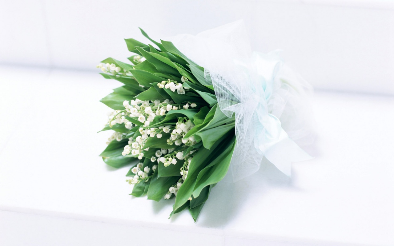 Description: A bouquet of flowers sitting on a white surface with a ribbon around it's end and a white background.