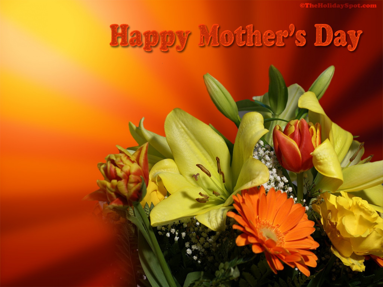Description: A bouquet of flowers with a happy mother's day message in the background of the image with a red and yellow background.