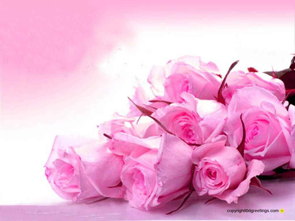 Description: A bouquet of pink roses sitting on top of a table next to a vase of flowers on a table.