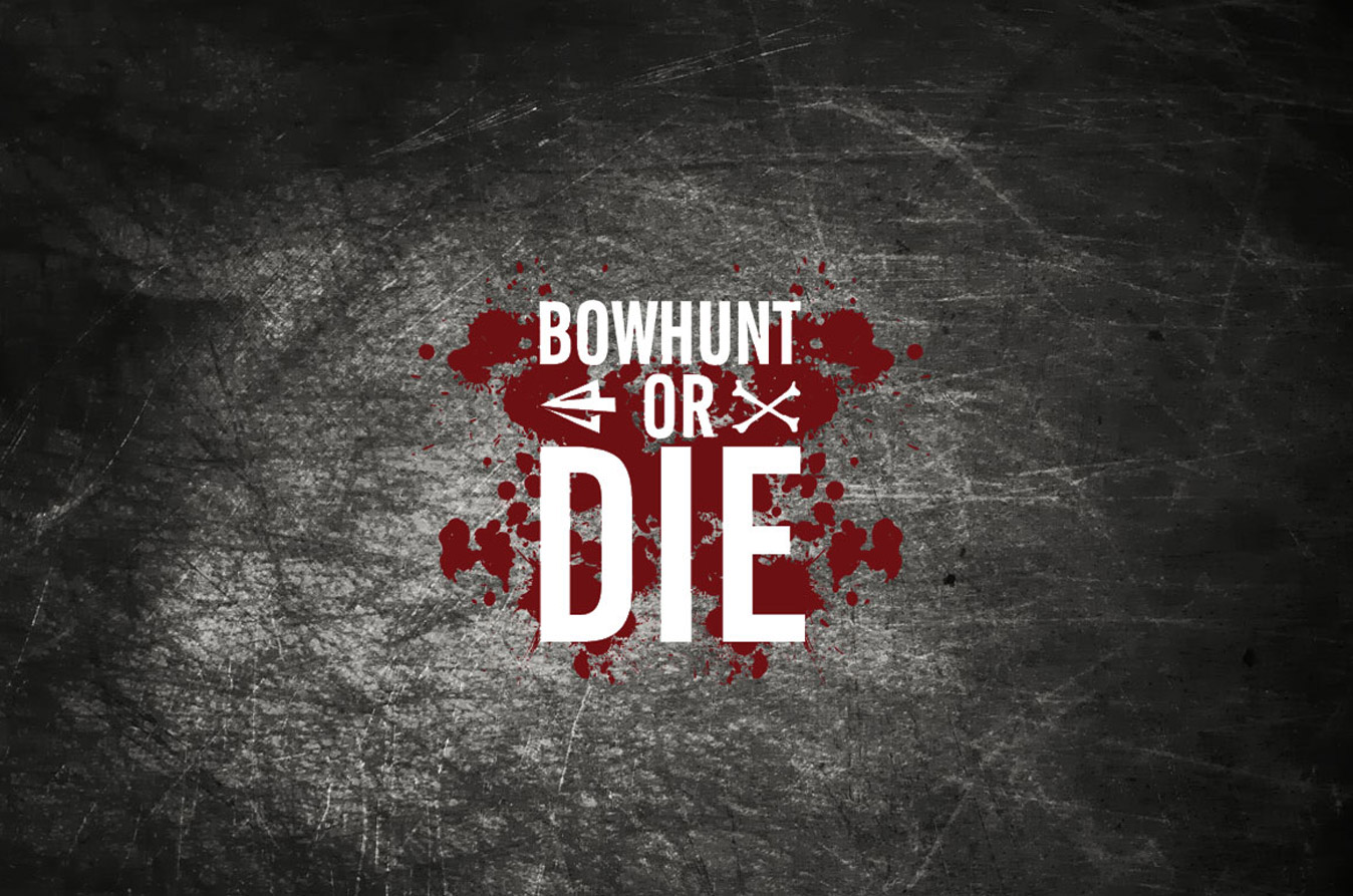 Description: A black and red background with the words bowhunt or die on it and a bloody hand drawn arrow.