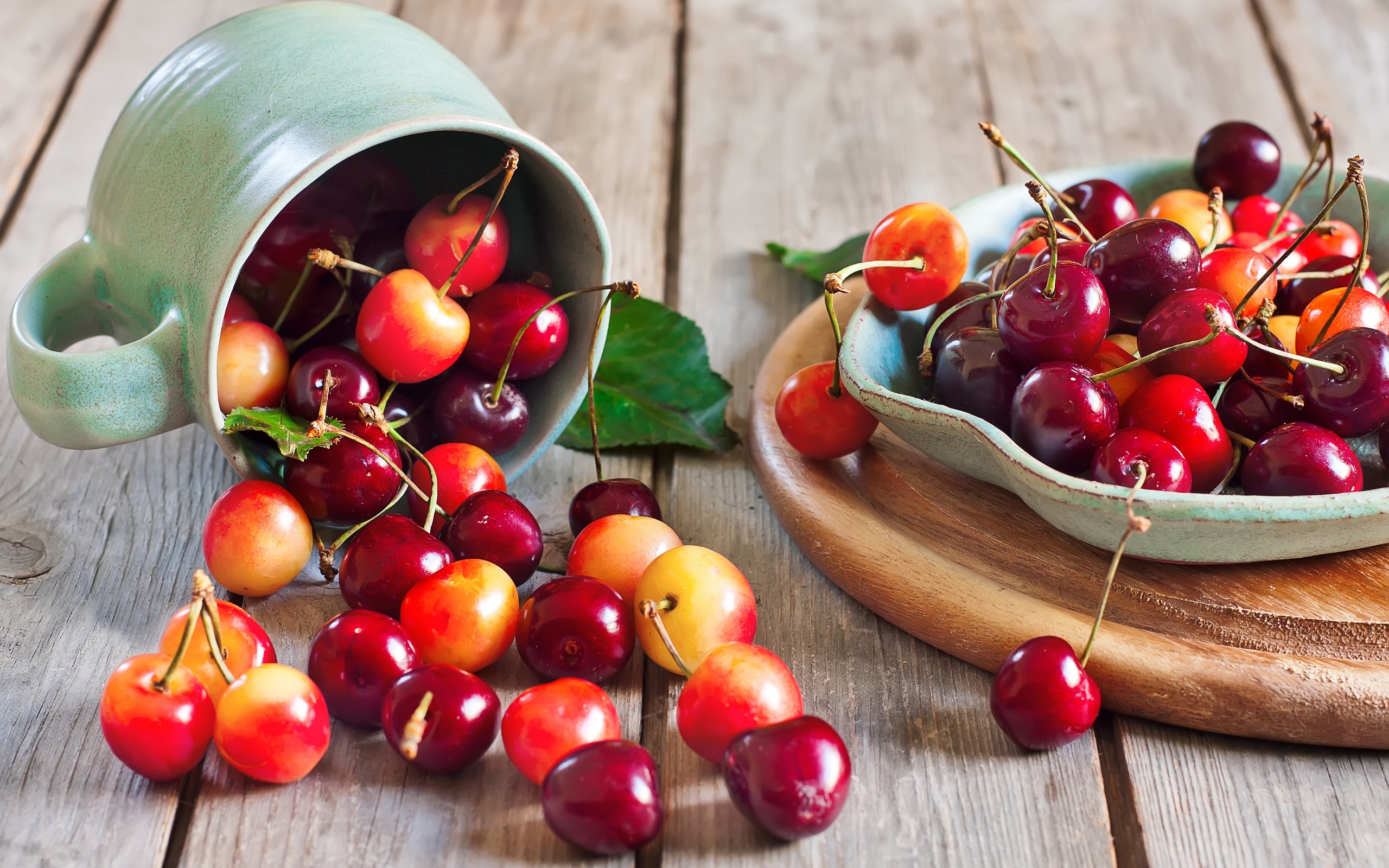 Description: A bowl of cherries on a wooden table with a green cup of cherries on the table next to it.