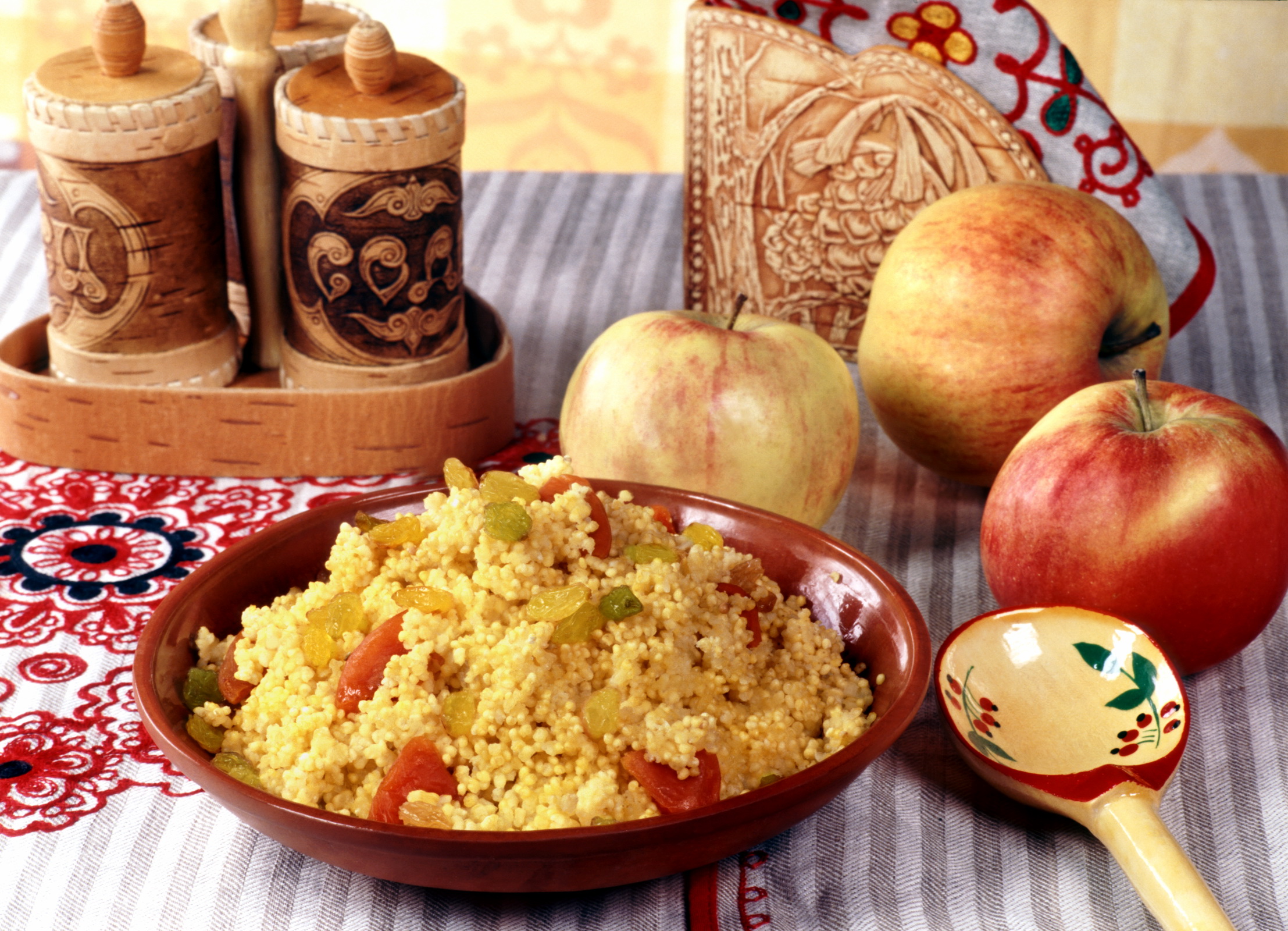 Description: A bowl of rice and apples on a table with a cloth and wooden spoons and a wooden box.