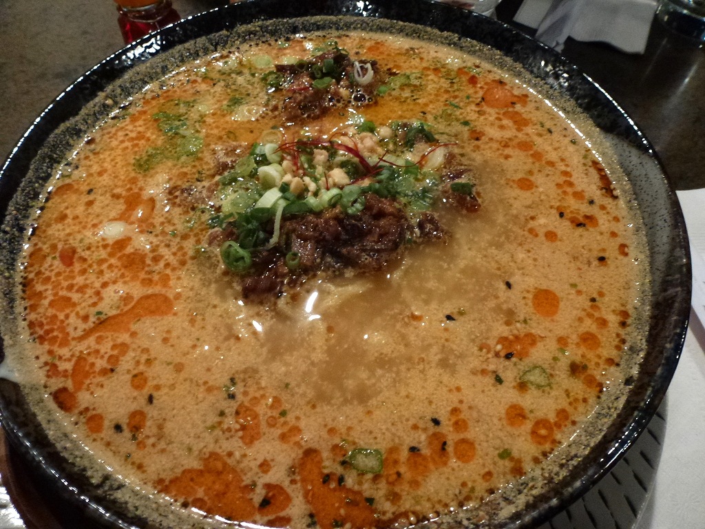 Description: A bowl of soup with meat and vegetables in it on a table top with a napkin and a glass of water.