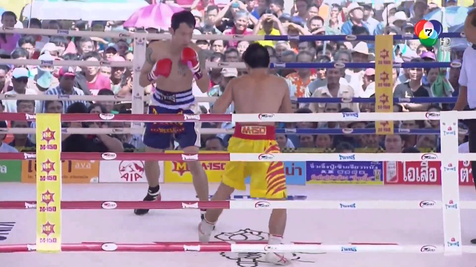 Description: A man standing next to a man in a boxing ring with a referee behind him and a crowd watching.