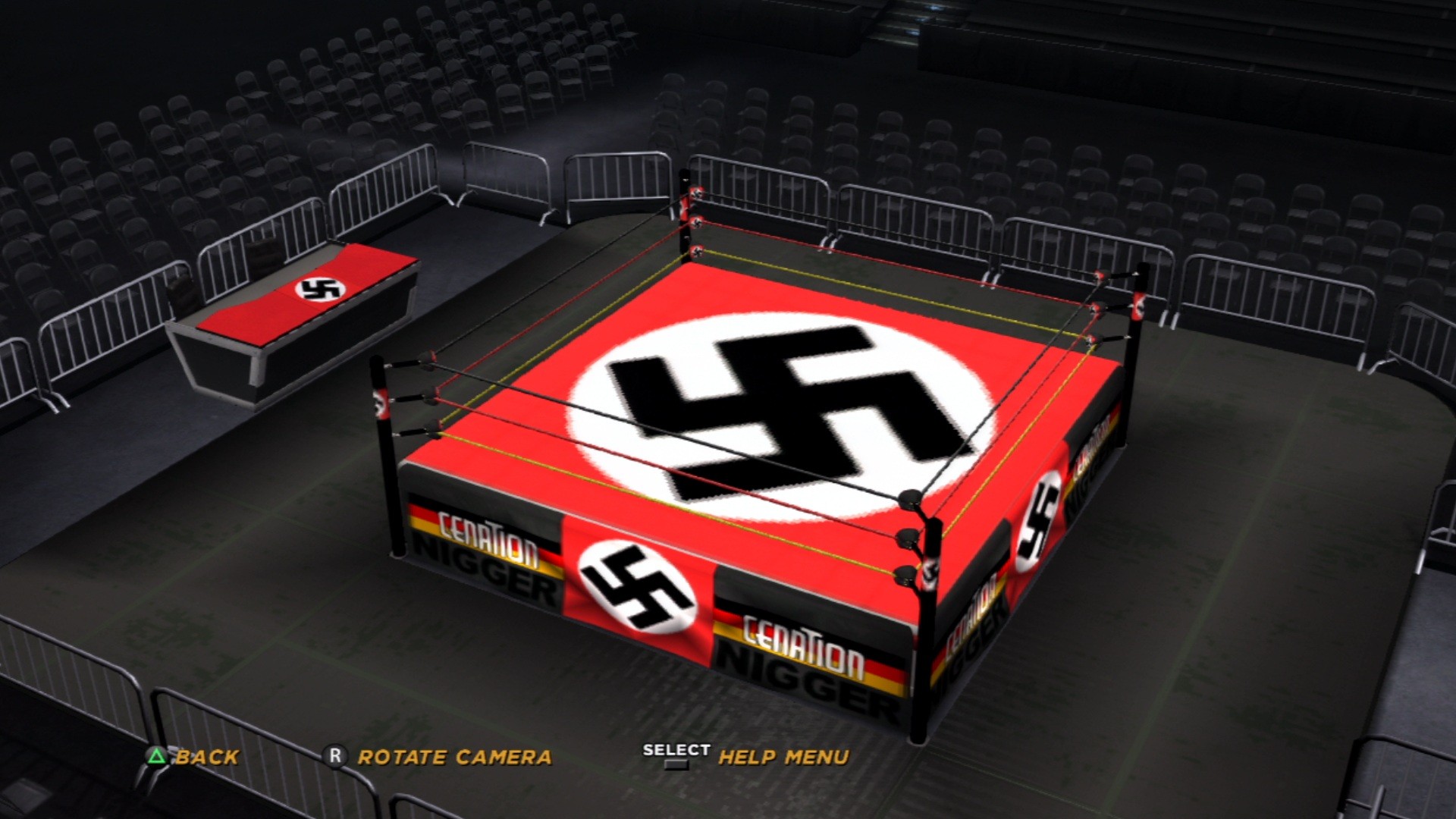 Description: A boxing ring with a hammer and a symbol on it in a darkened room with a crowd of people.