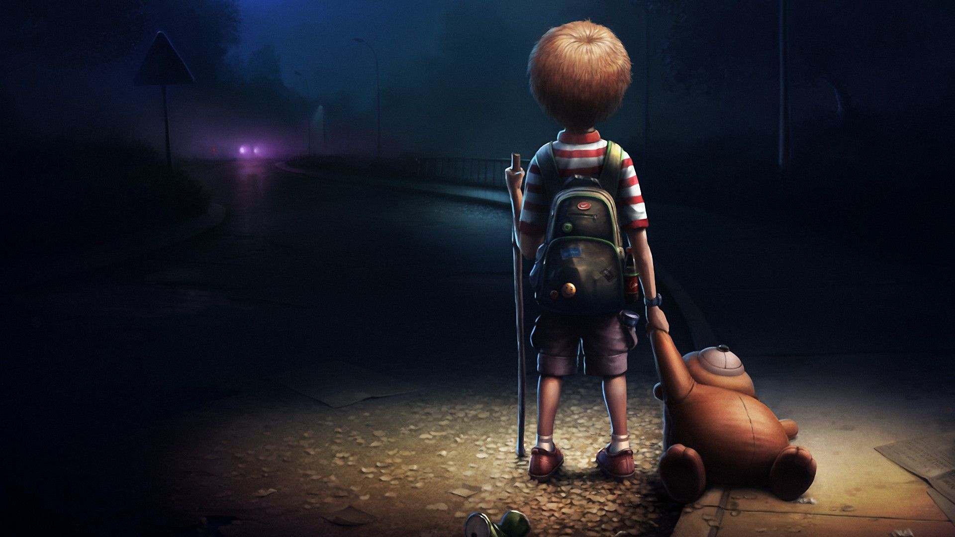 Description: A boy with a backpack and a backpack standing in the dark with a teddy bear and a flashlight in his hand.