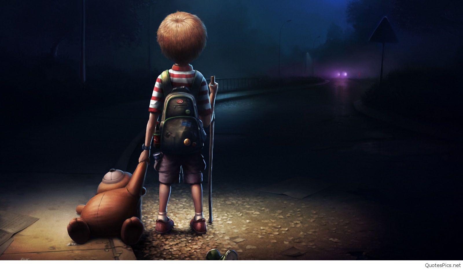 Description: A boy with a backpack and a teddy bear in the dark with a flashlight on his head and a backpack on his back.