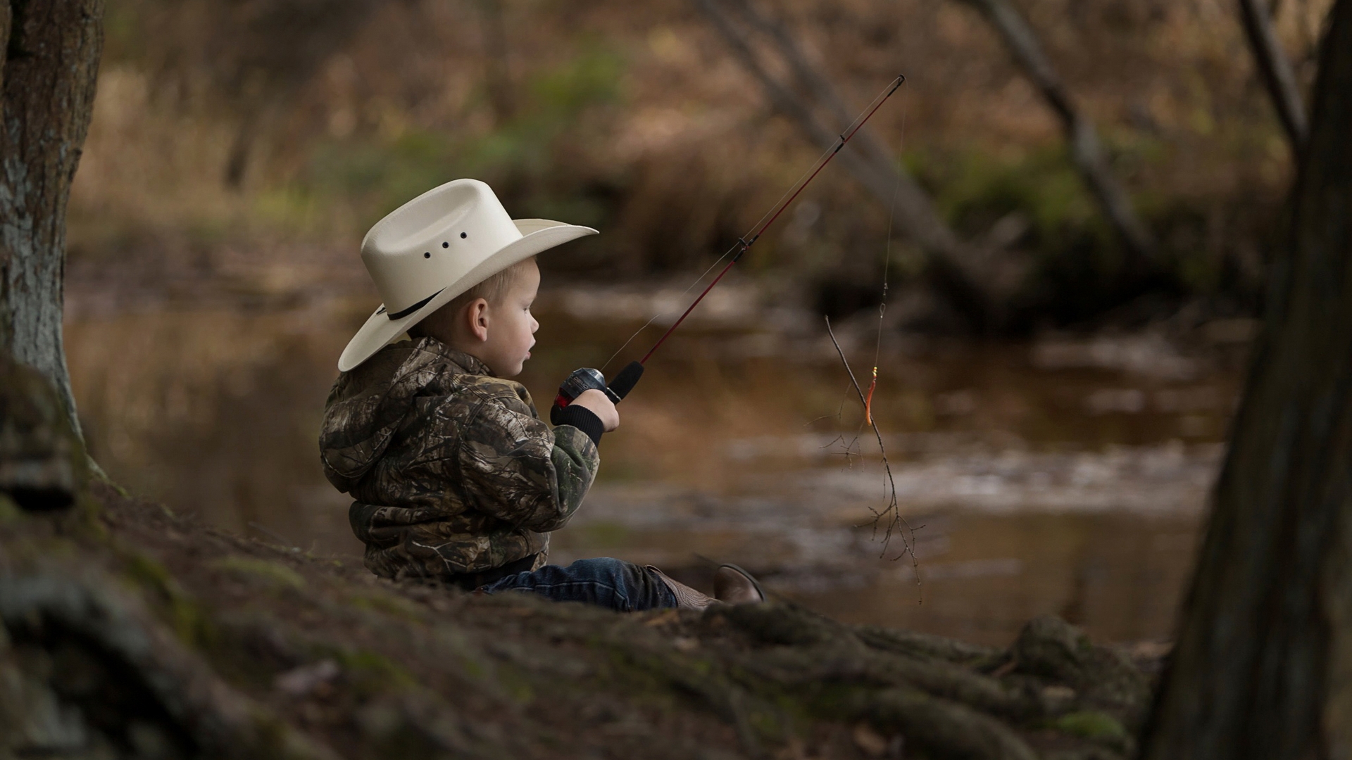 Description: A young boy in a cowboy hat fishing in a stream with a fishing rod and a fishing pole in his hand.
