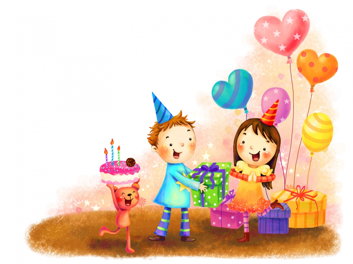 Description: A boy and a girl are celebrating a birthday with a cake and balloons and a dog and a cat.