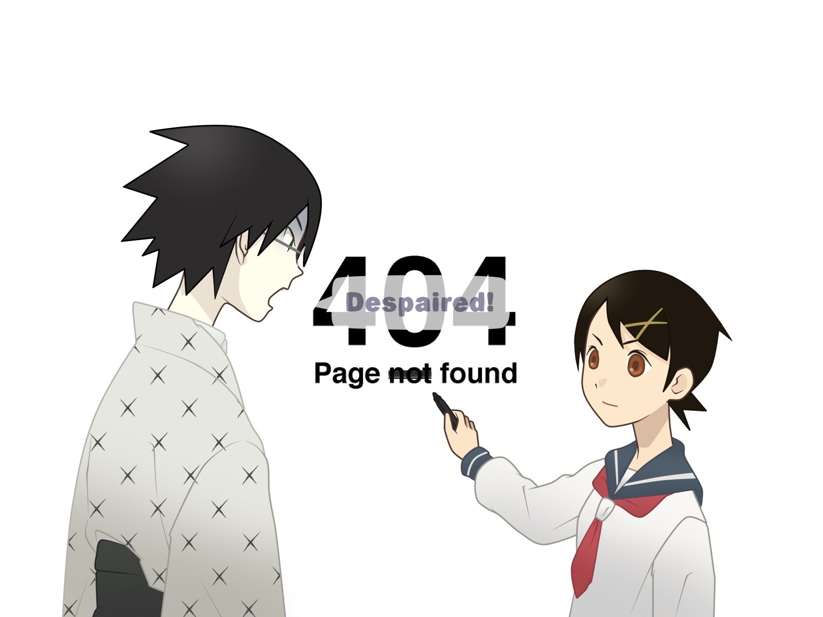 Description: A boy and a girl are looking at a cell phone screen with the caption page not found on it.
