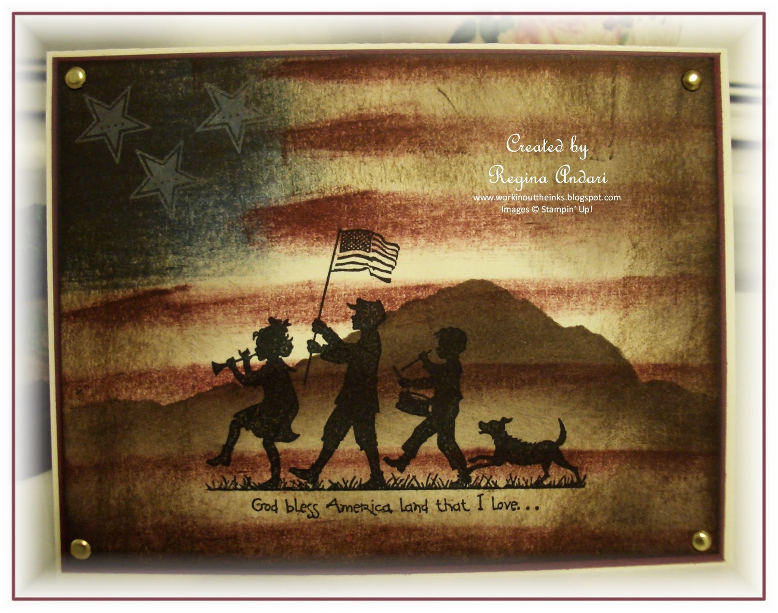 Description: A picture of a boy and girl holding a flag and a dog with a flag on it and a mountain in the background.