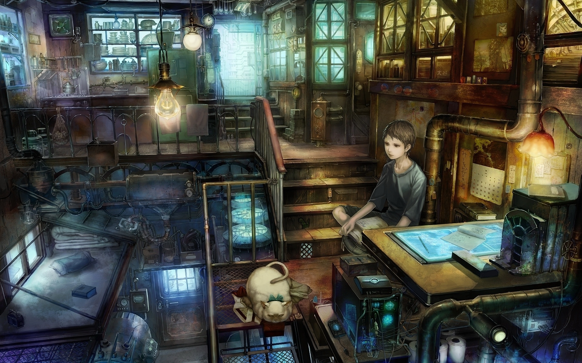 Description: A boy sitting at a table in a room filled with lots of furniture and a cat on the floor.