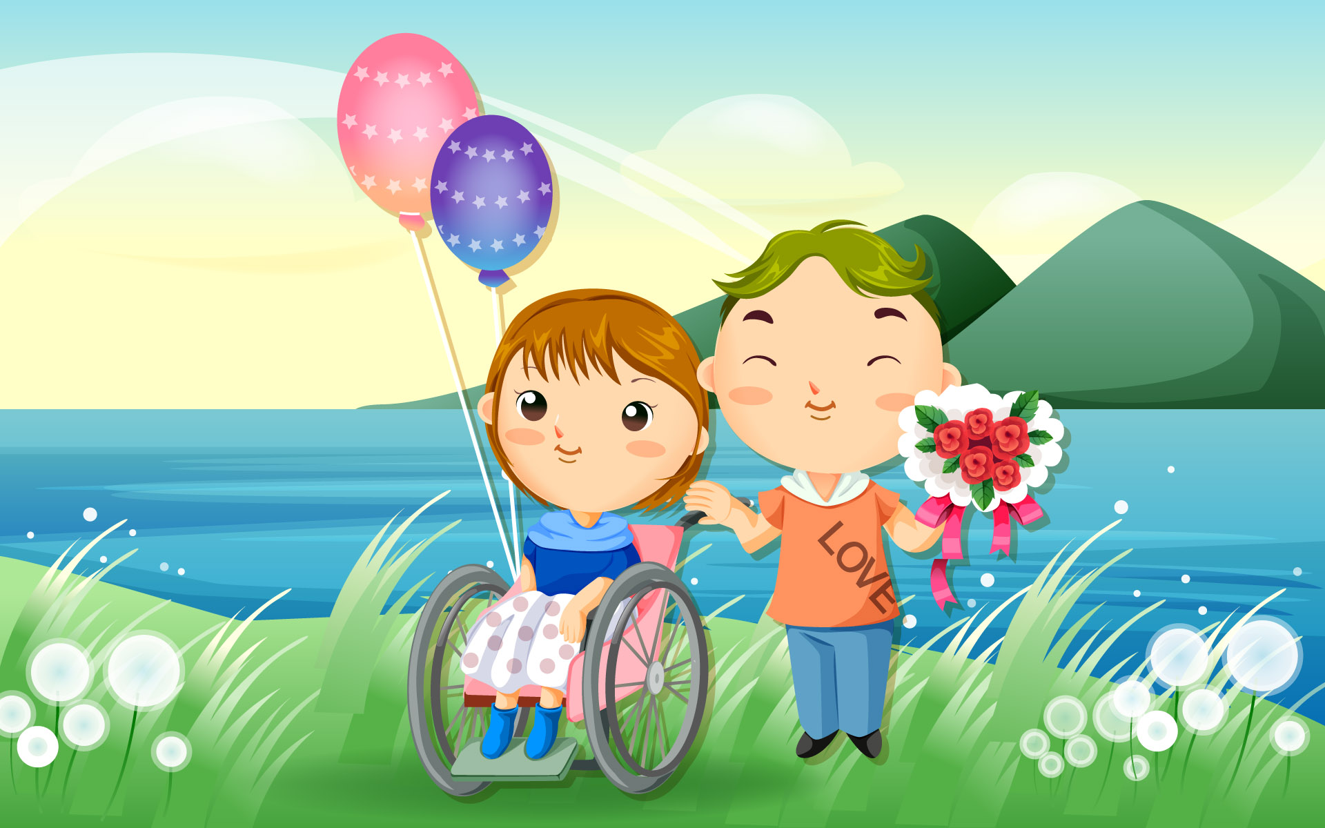 Description: A boy in a wheel chair holding a bouquet of flowers and a girl in a wheelchair with balloons in the grass.