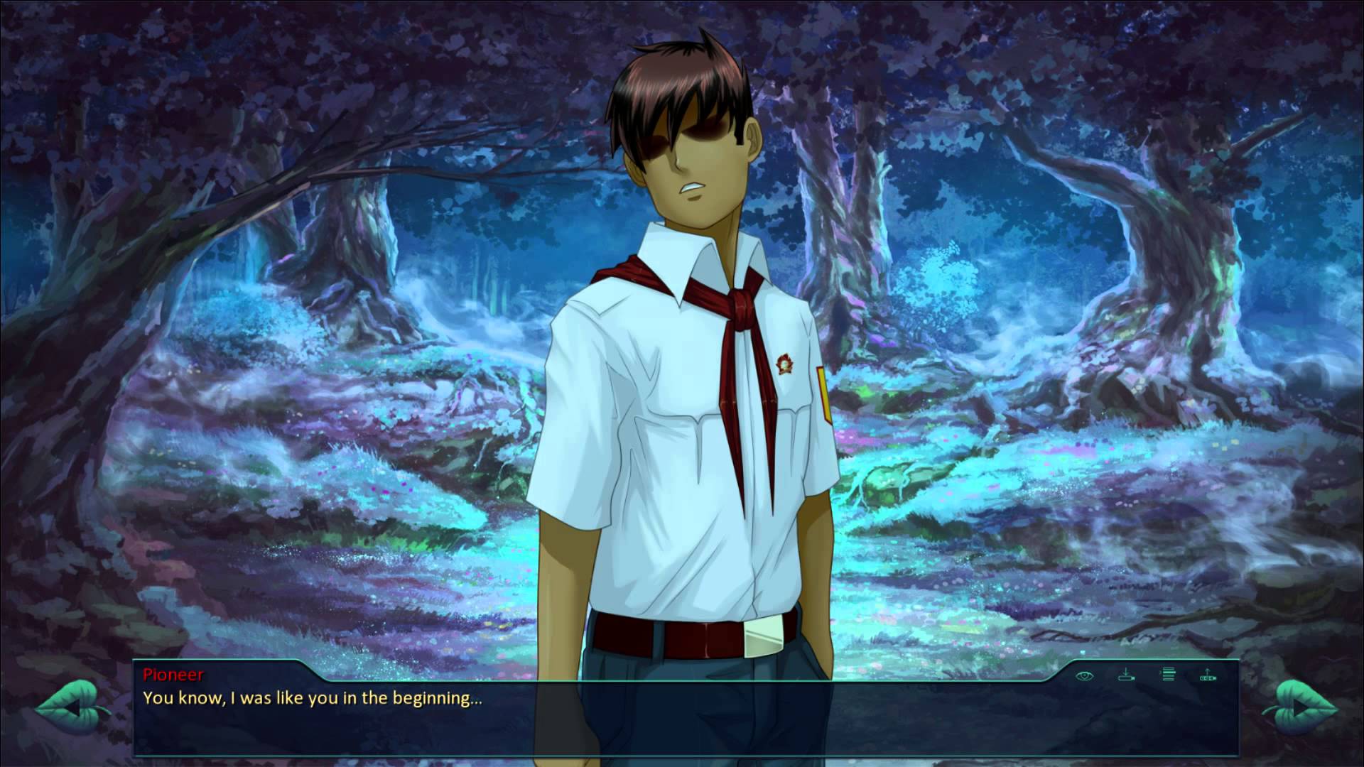 Description: A boy in a white shirt and tie standing in a forest with trees and bushes in the background and a blue sky.
