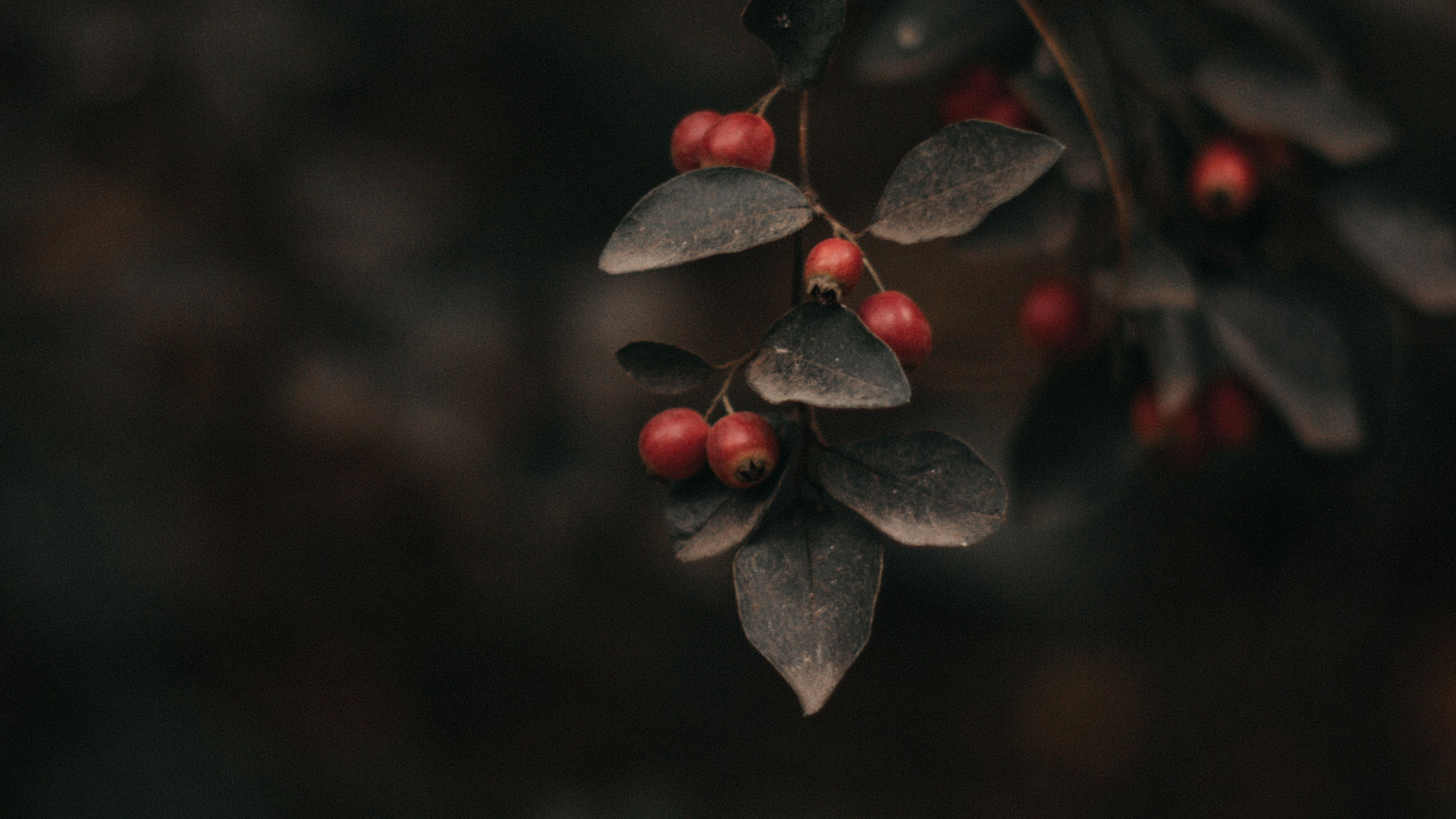 Description: A branch with berries and leaves on it with a blurry background of leaves and berries on it with a blurry background of leaves and red berries.