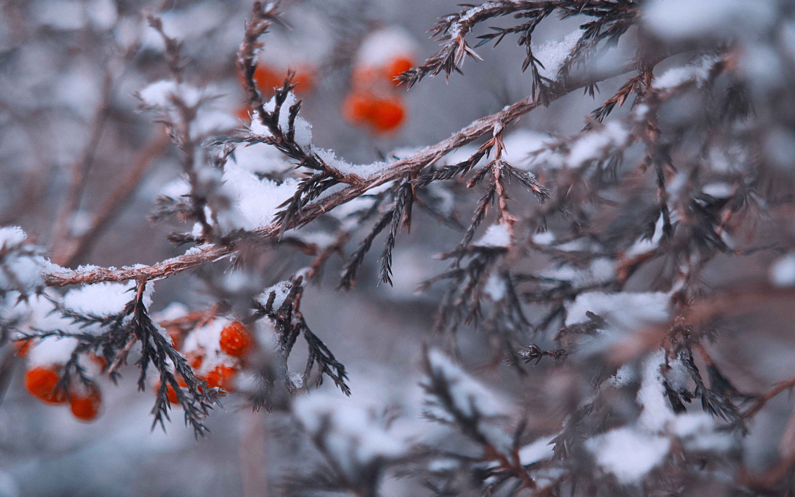 Description: A branch with some red berries on it in the snow covered branches of a tree with snow on it.