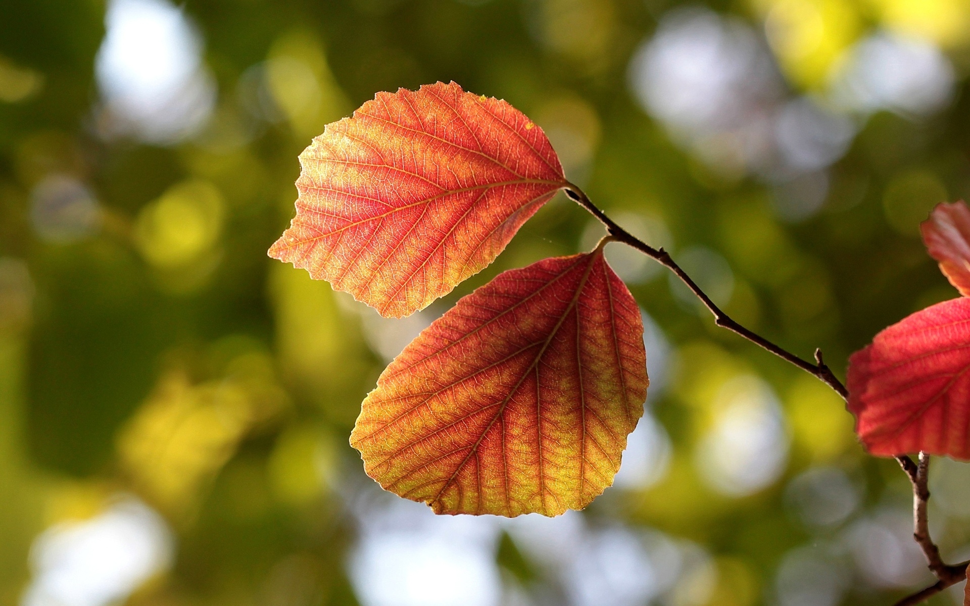 Description: A branch with two leaves on it with a blurry background of trees in the background.