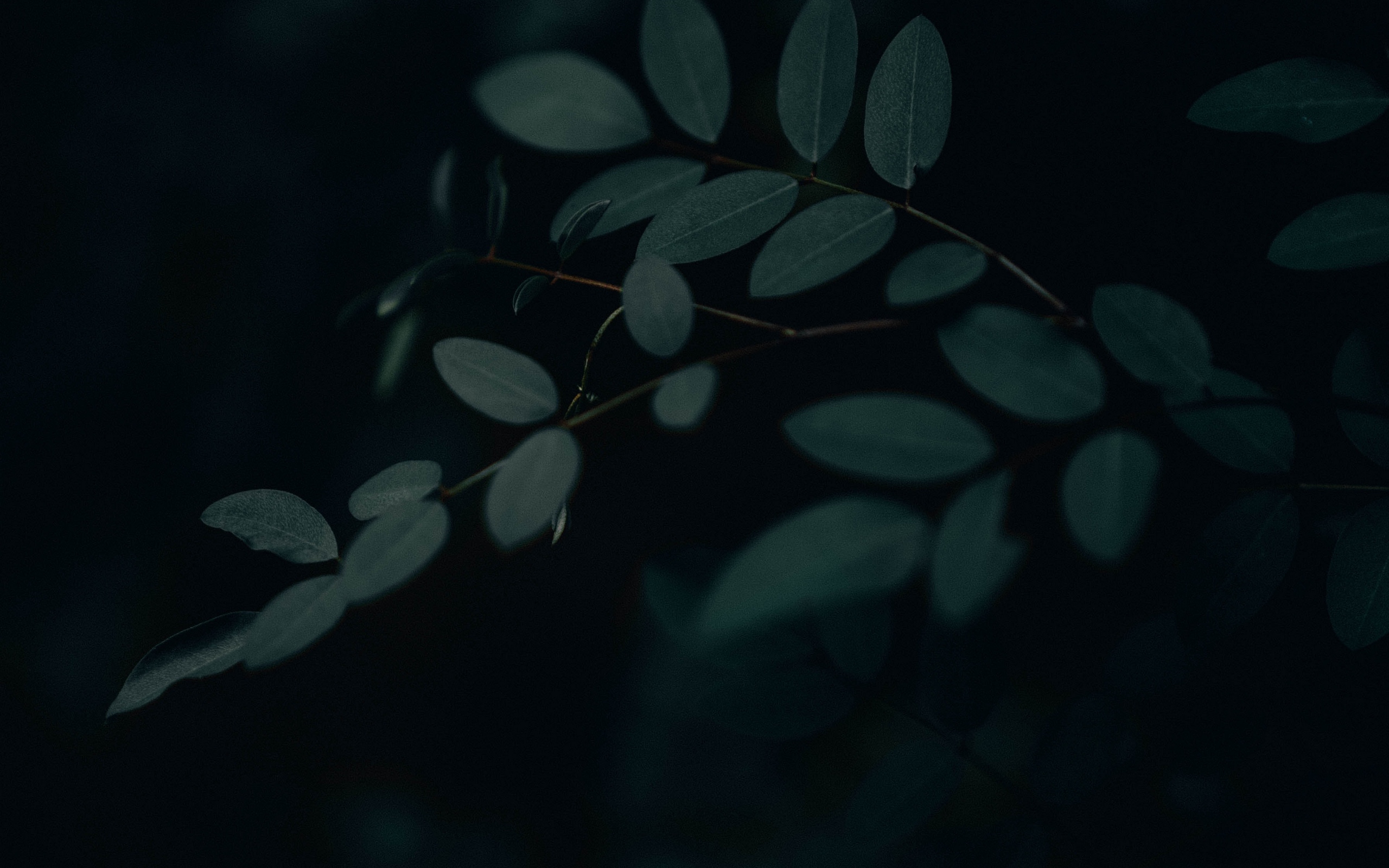 Description: A branch with leaves in the dark with a blurry background of leaves on it.