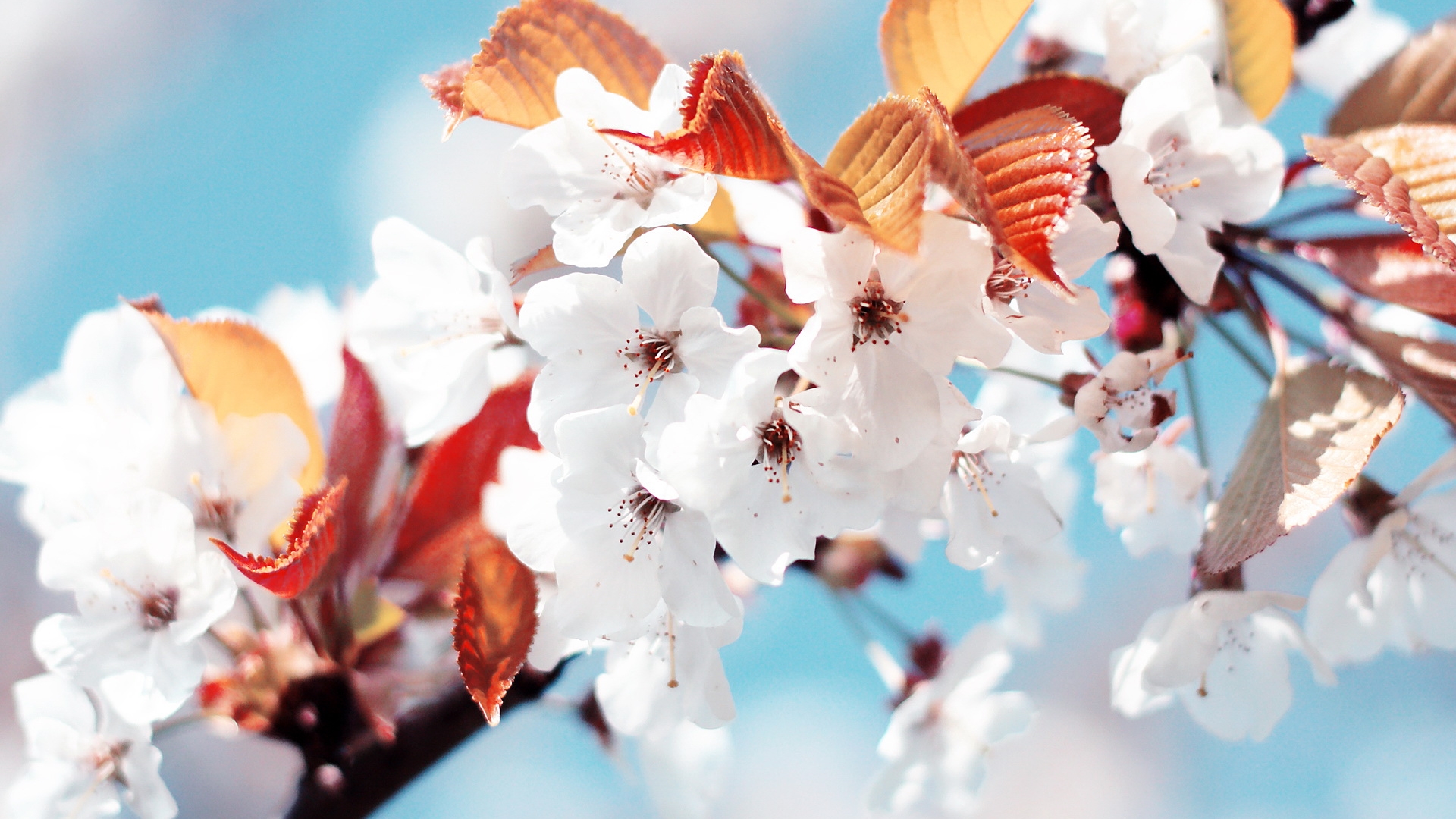 Description: A branch with white flowers and leaves on it with a blue sky in the background with a few clouds.