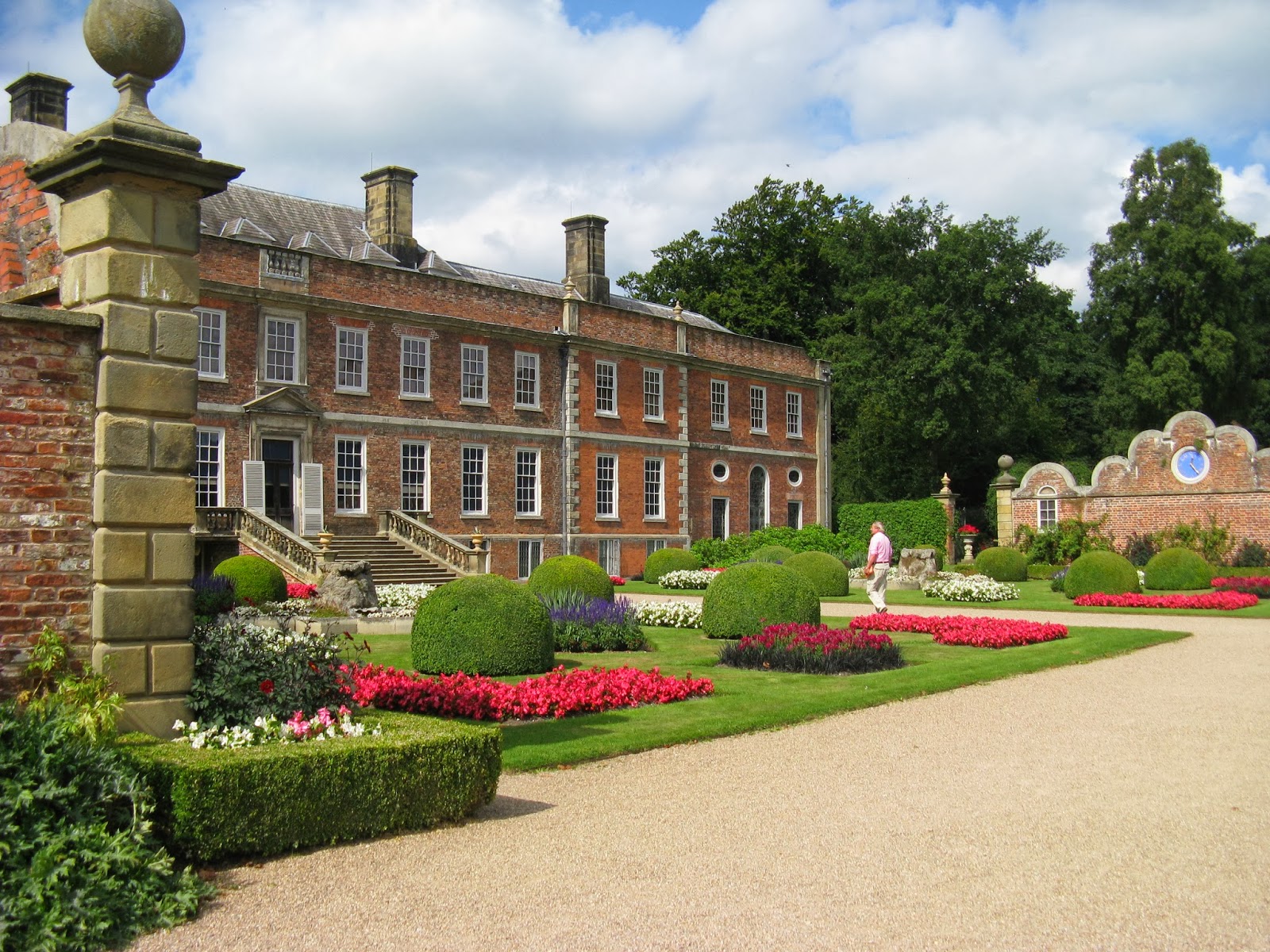 Description: A large brick building with a garden in front of it and a walkway leading to it and a walkway leading to the building.