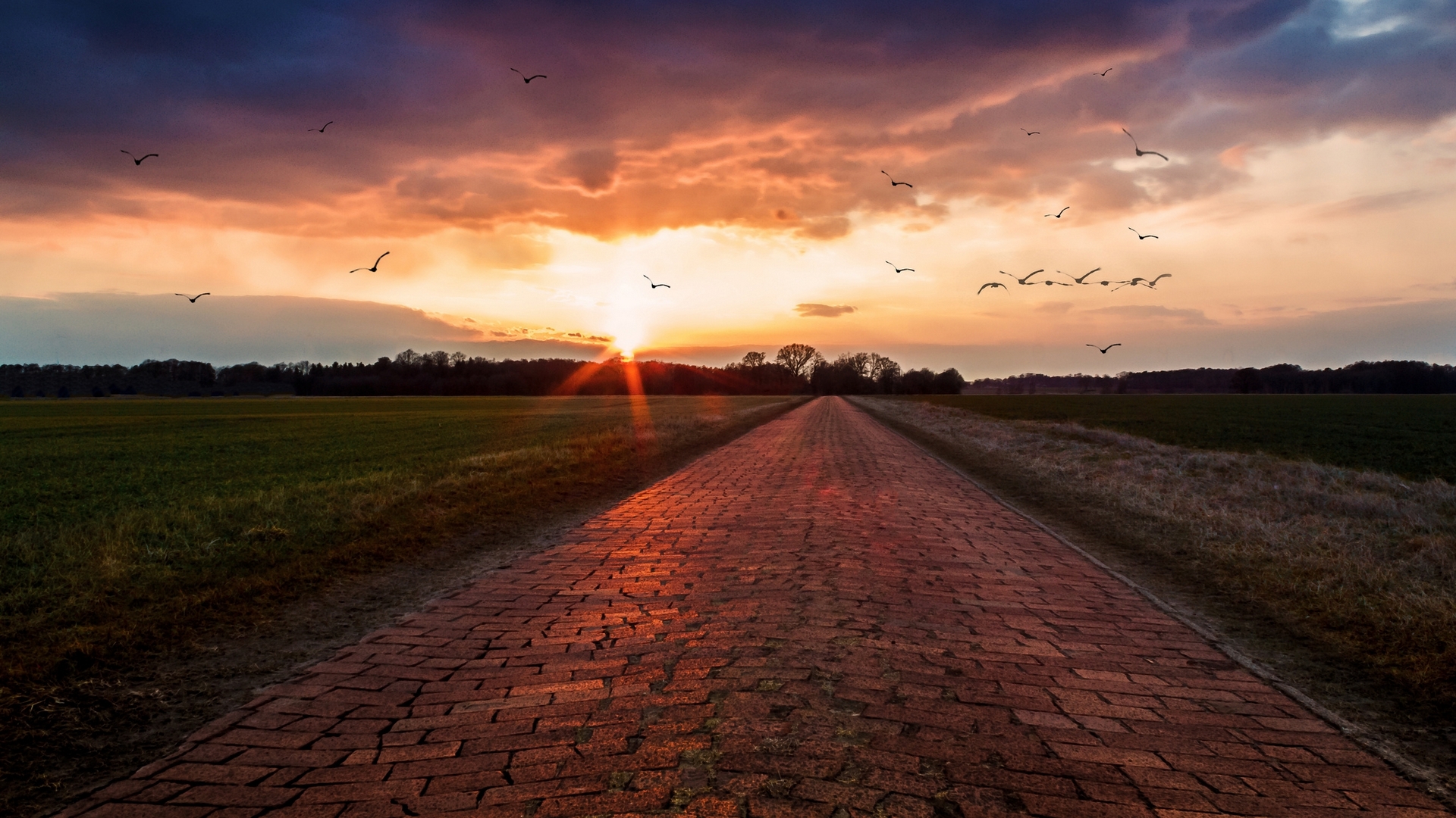 Description: A brick road with birds flying in the sky at sunset or dawn or dawn or dawn or dawn or dawn.