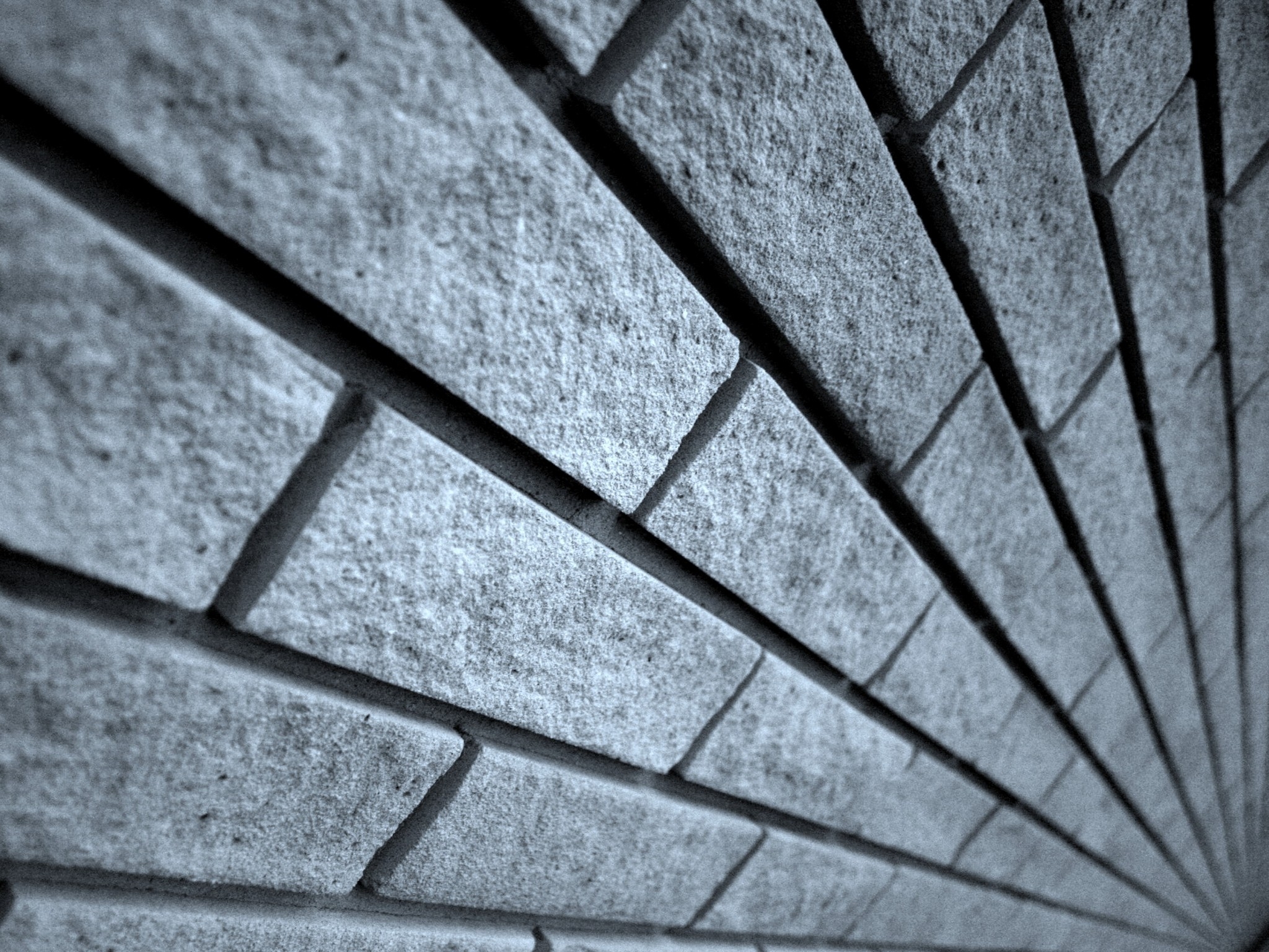 Description: A close up of a wall made of bricks and concrete blocks with a black and white photo of the top.