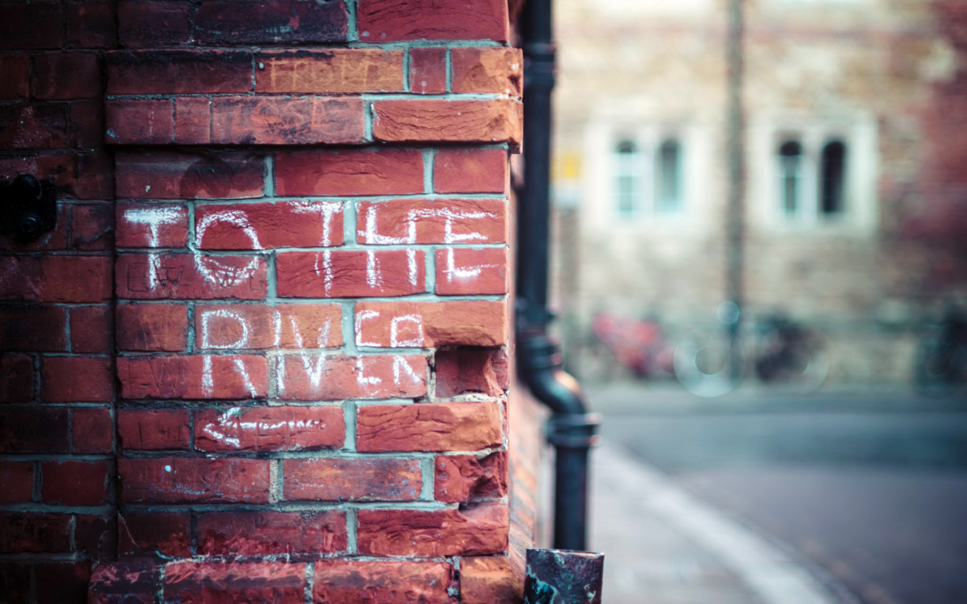 Description: A brick wall with graffiti on it that says to the river on it and a street in the background.