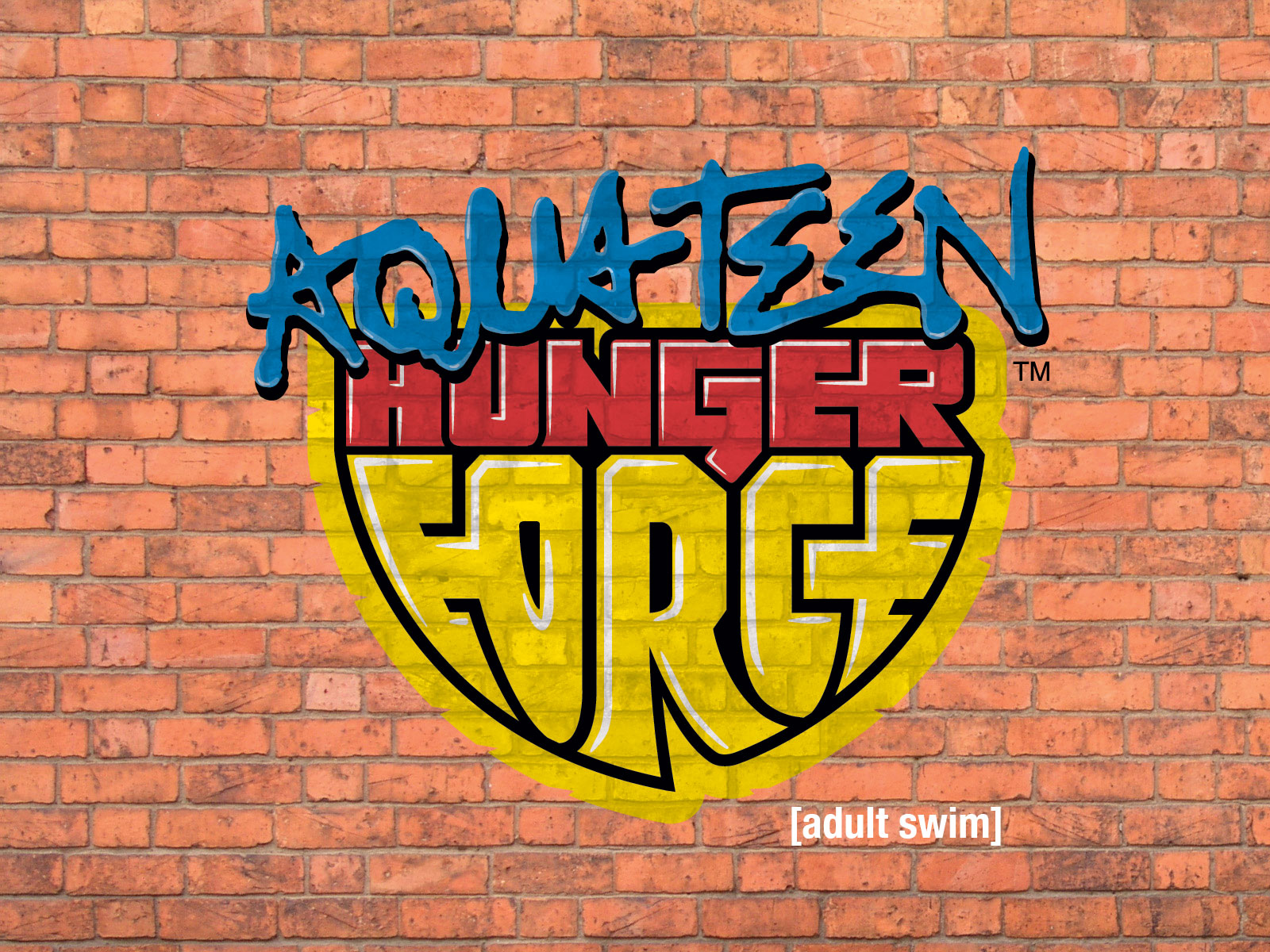 Description: A brick wall with graffiti on it and the words ronitzen hunger force painted on it in blue and yellow.