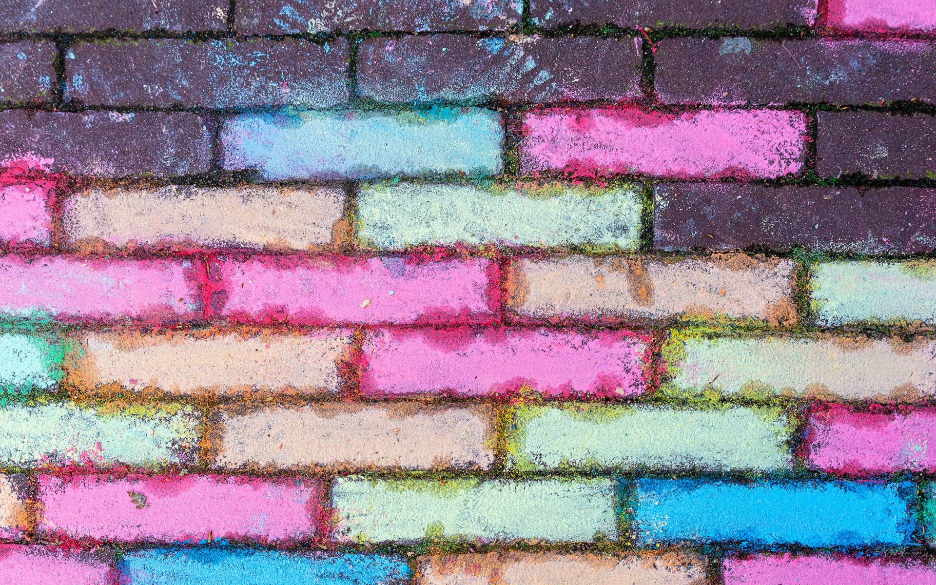 Description: A brick wall with pastel colors painted on it in different colors of pink.